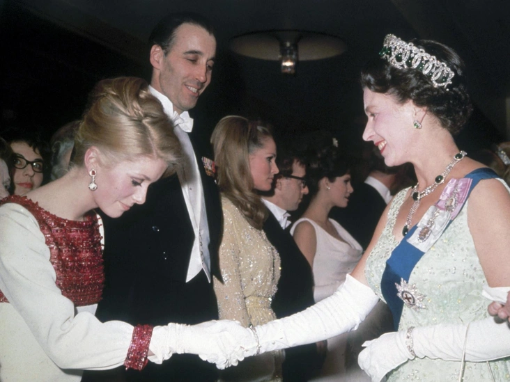 В 1965 году благодаря своему мужу, фотографу журнала Playboy, Дэвиду Бейли, Катрин Денев знакомится с модельером Ив Сен-Лораном и между ними завязываются не только деловые, но и многолетние дружеские отношения. Для выхода на торжественный прием у Елизаветы II актриса выбрала белое кутюрное платье с бисерной вставкой на груди и манжетах именно от модного Дома Saint Laurent.