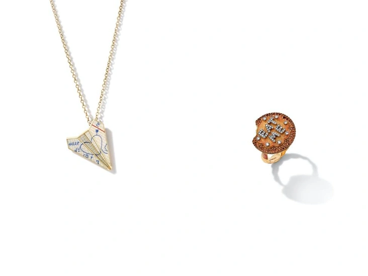 Назвать украшения Лизы Борзой «наивными» все-таки не повернется язык — это серьезное ювелирное искусство: золото 750 пробы, бриллианты, роспись горячей эмалью, кропотливая ручная работа и соответствующий ценник. Оттого круче получается контраст «серьезного» и «несерьезного»: у бренда есть кольца-печенюшки, подвески в виде самолетиков из тетрадных листов или газеты «Правда», а еще увесистое бриллиантовое сердце с красной надписью «Люблю», словно с советских транспарантов.