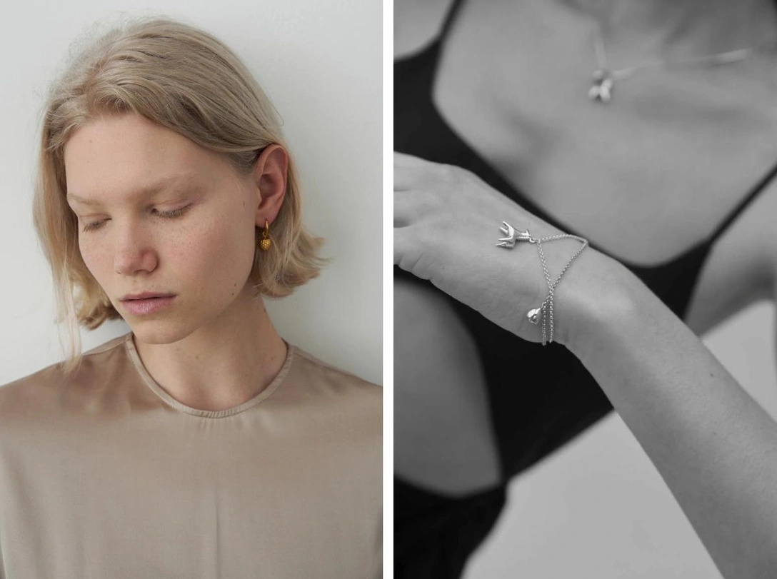 Украшения из последних коллекций локальной марки напоминают обо всем хорошем, что было в далеком детстве. Мегахит Qari Qris — серебряная лошадка, которая повторяет очертания знаменитой дымковской игрушки. Лошадку выпускают в трех размерах: ее можно подвесить на сережки-хупы, носить на шее или на запястье. Еще у бренда есть чудесные подвески-ягодки, которые, если честно, напоминают одновременно и ягоды, и сосновые шишки, которыми в детстве на даче мы набивали карманы.