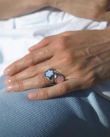 Кто рос в 1990-х, еще помнит цветные детские колечки, которыми можно было ставить настоящие штампы — чаще всего с сердечком, цветочком или каким-нибудь животным. Кольца уральской марки Moonswoon навевают теплые воспоминания о тех днях. Украшения сделаны из серебра, вставки с незабудкой или сердечком — полимерная эмаль. Наивно, нежно и очень по-летнему.