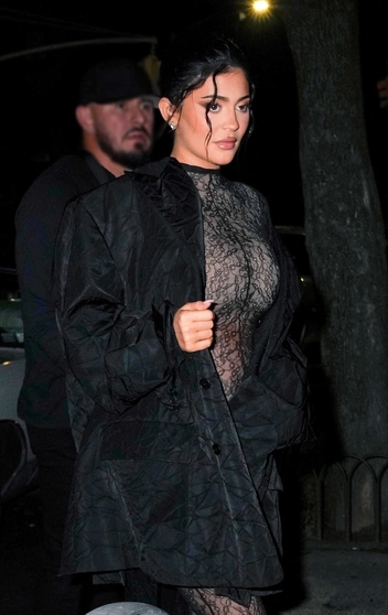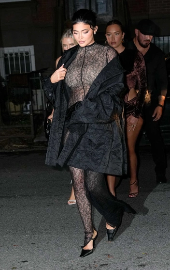 За время своей беременности в 2021 году Кайли успела появиться на публике в нескольких скандальных луках. Возможно, вдохновившись нарядом старшей сестры Ким, селебрити облачилась в черный полупрозрачный комбинезон по фигуре из тонкого кружева. К нему Кайли добавила объемное пальто и мюли с острым мысом.