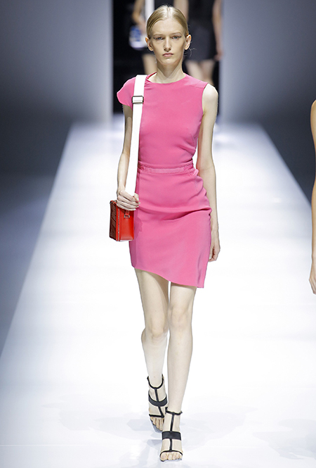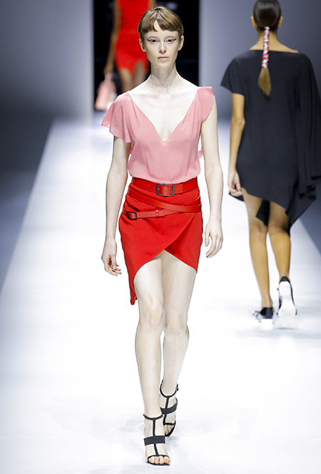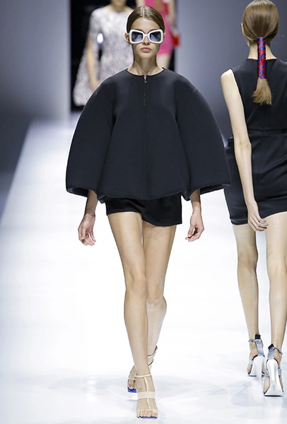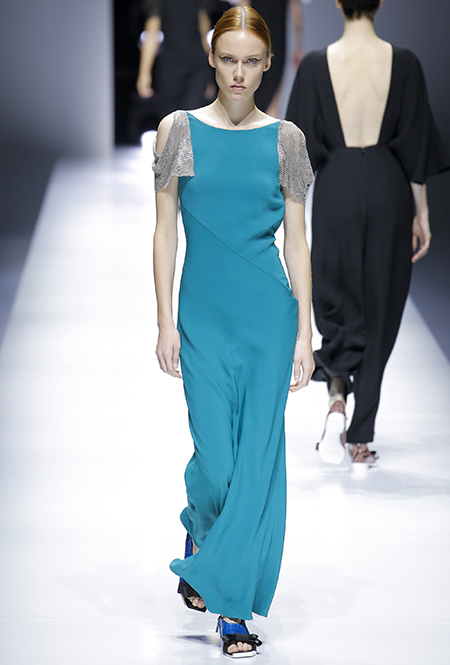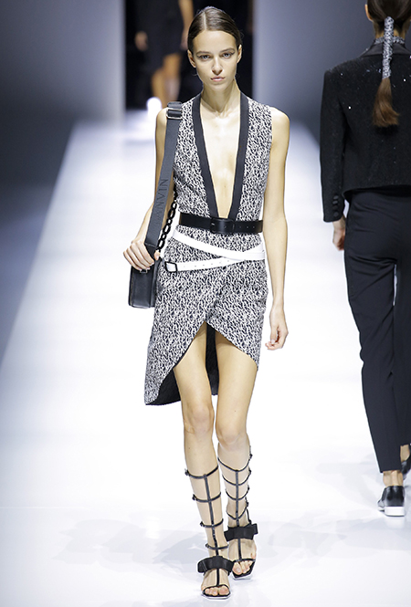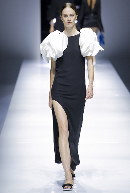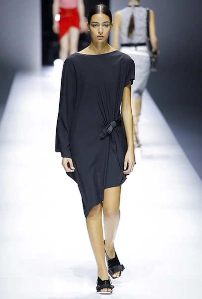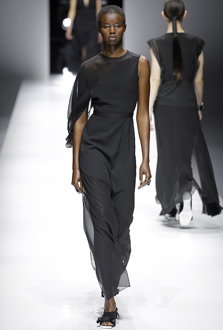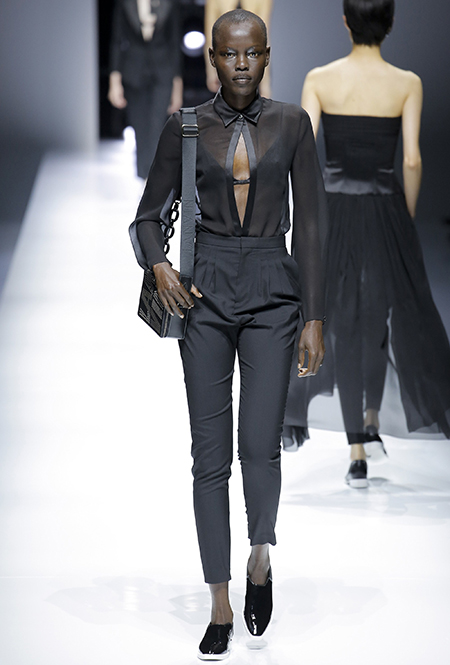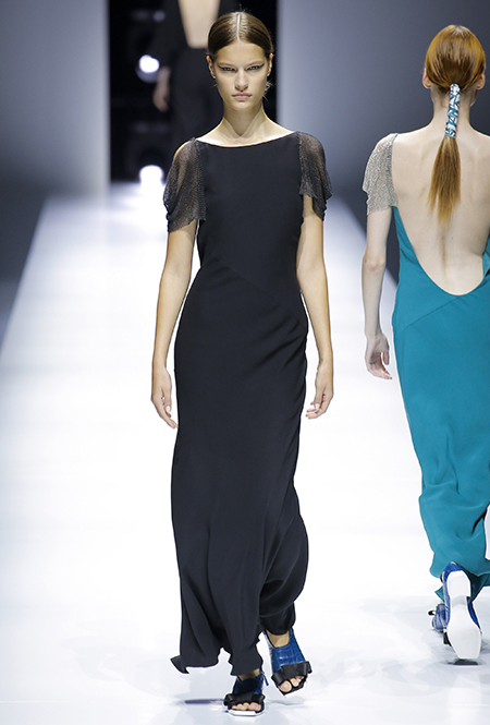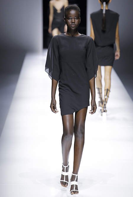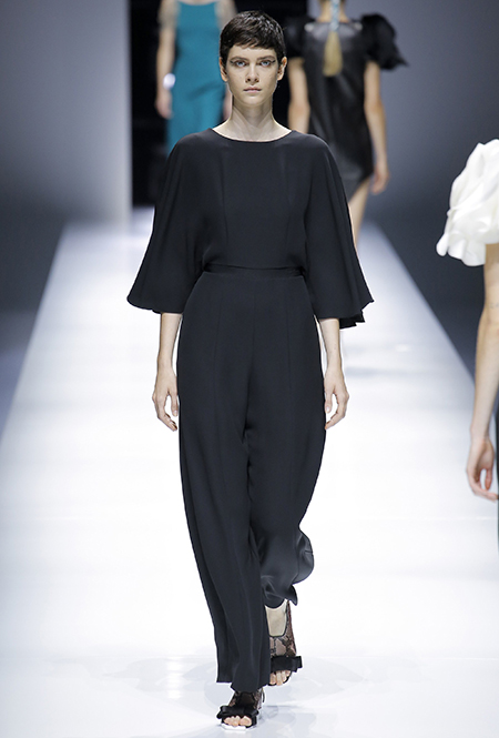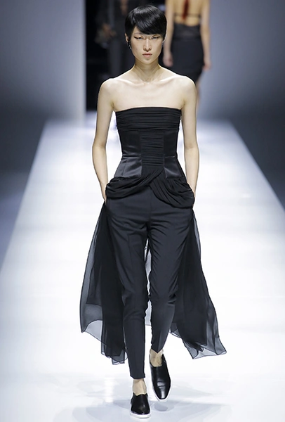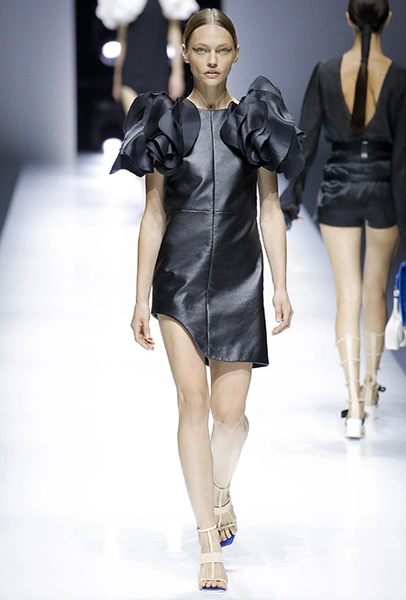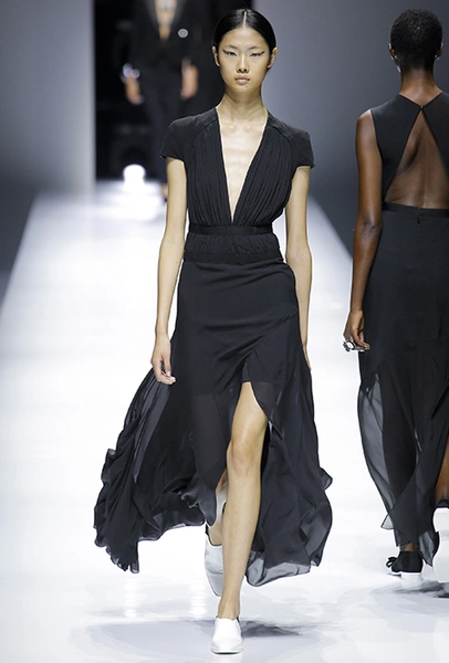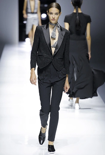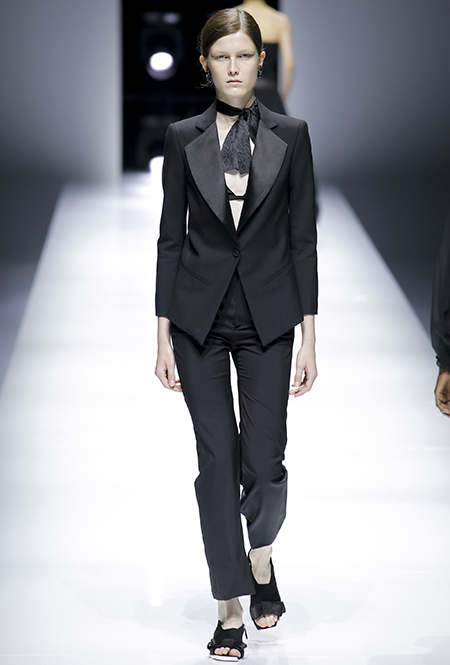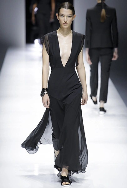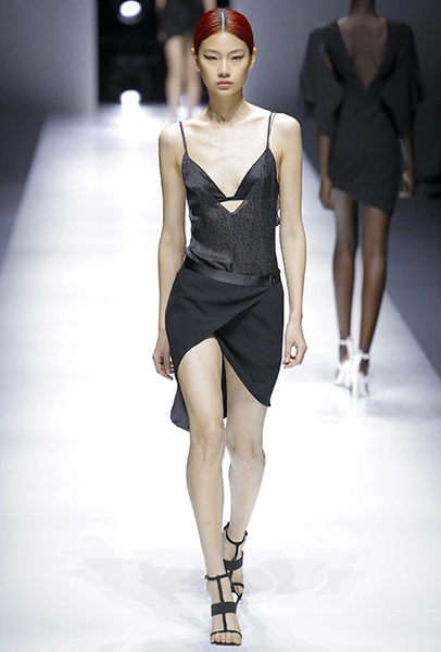 Показ начался с блока черных ладно скроенных платьев, жакетов и узких брюк. Здесь отлично продуман баланс практичности и сексуальности. Брючные костюмы подойдут и для бизнес-встречи, и для торжественного коктейля, а вот платья-комбинации на узких лямках и с глубокими вырезами, под которыми видно белье в тон – уже сугубо вечерняя история.
