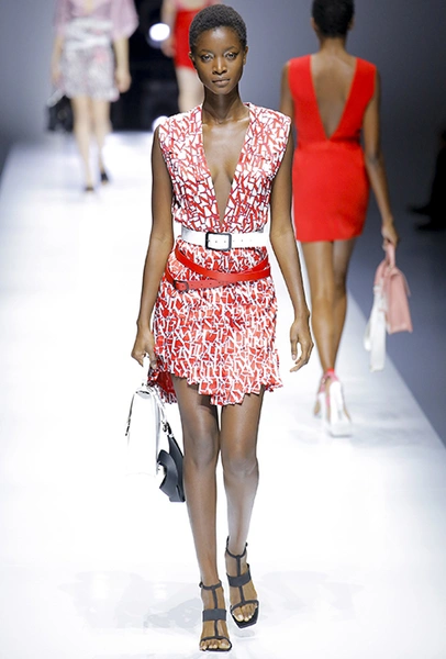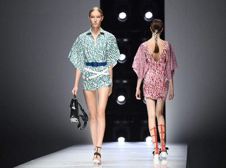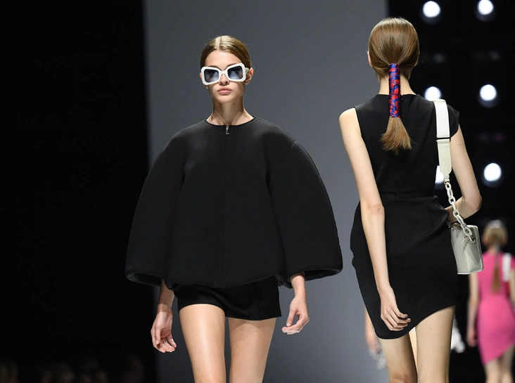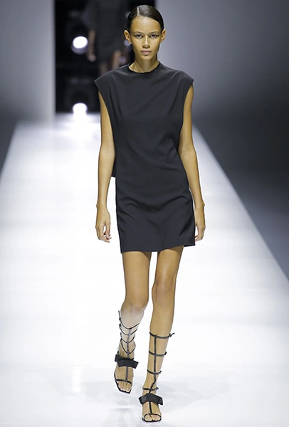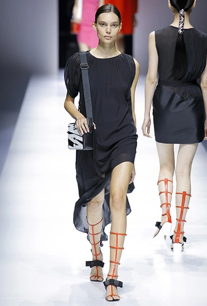 Небольшие прямоугольные сумки на толстых лямках и тоже с названием модного дома, написанным крупными буквами, уже сейчас так легко представить в Instagram (запрещенная в России экстремистская организация) главных модных инфлюенсеров планеты. Футуристичные сандалии-гладиаторы – здесь у них яркие минималистичные ремешки и украшения в виде бантов (аллюзия на классический Lanvin) – наверняка уже поселились в виш-листе не одного блогера.
