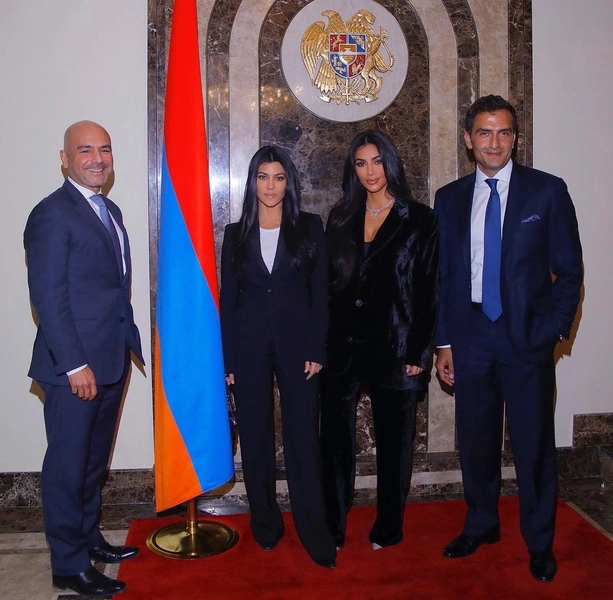 Более целомудренный вариант костюма в исполнении звезды соцсетей — приталенный бархатный жакет и свободные брюки, которые она примерила во время визита на свою историческую родину, в Армению. На встрече с президентом Арменом Саркисяном она выглядела вполне уместно рядом с политической элитой Еревана, что еще раз доказывает нам: Ким справится с любой ролью.
