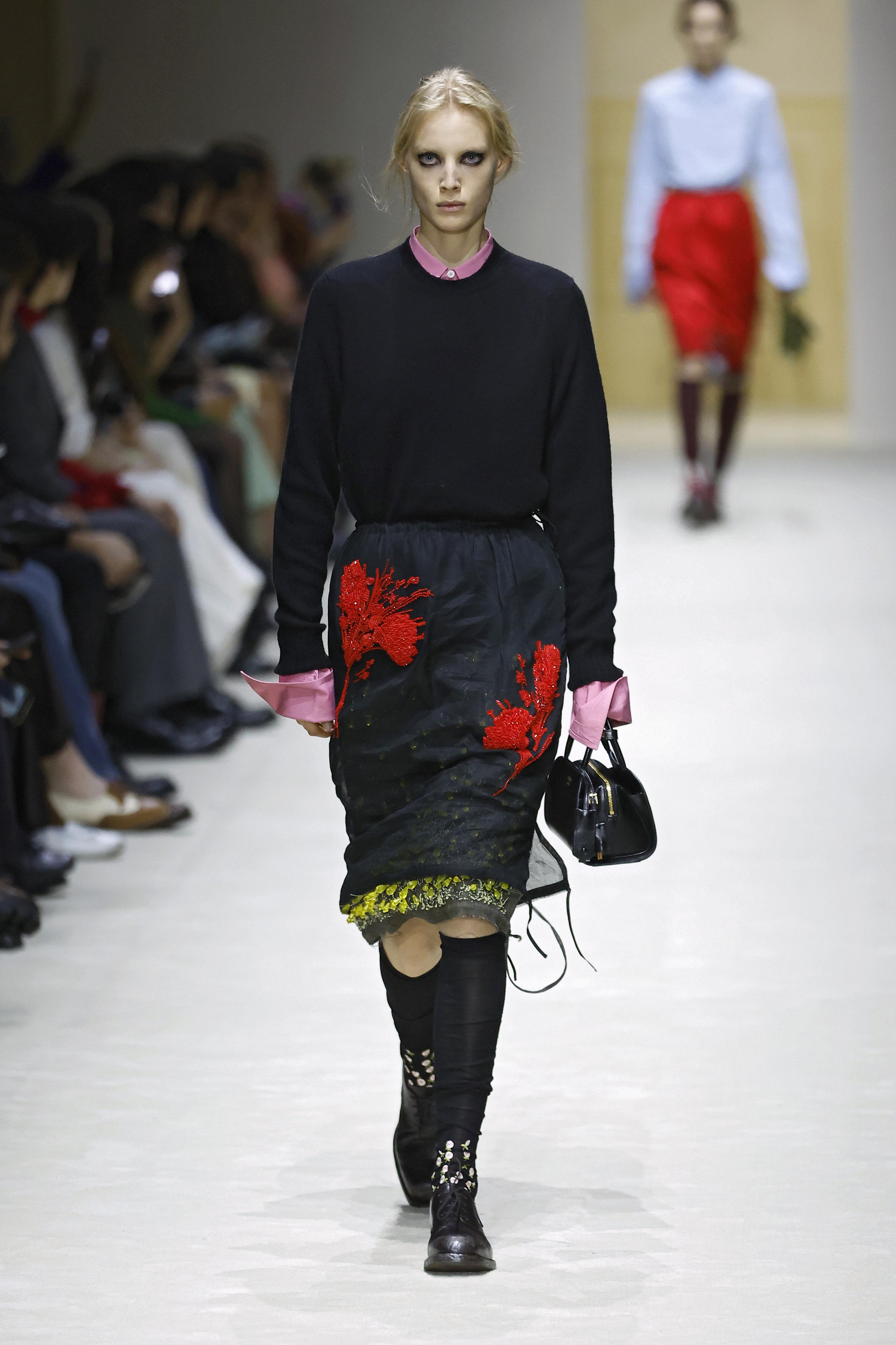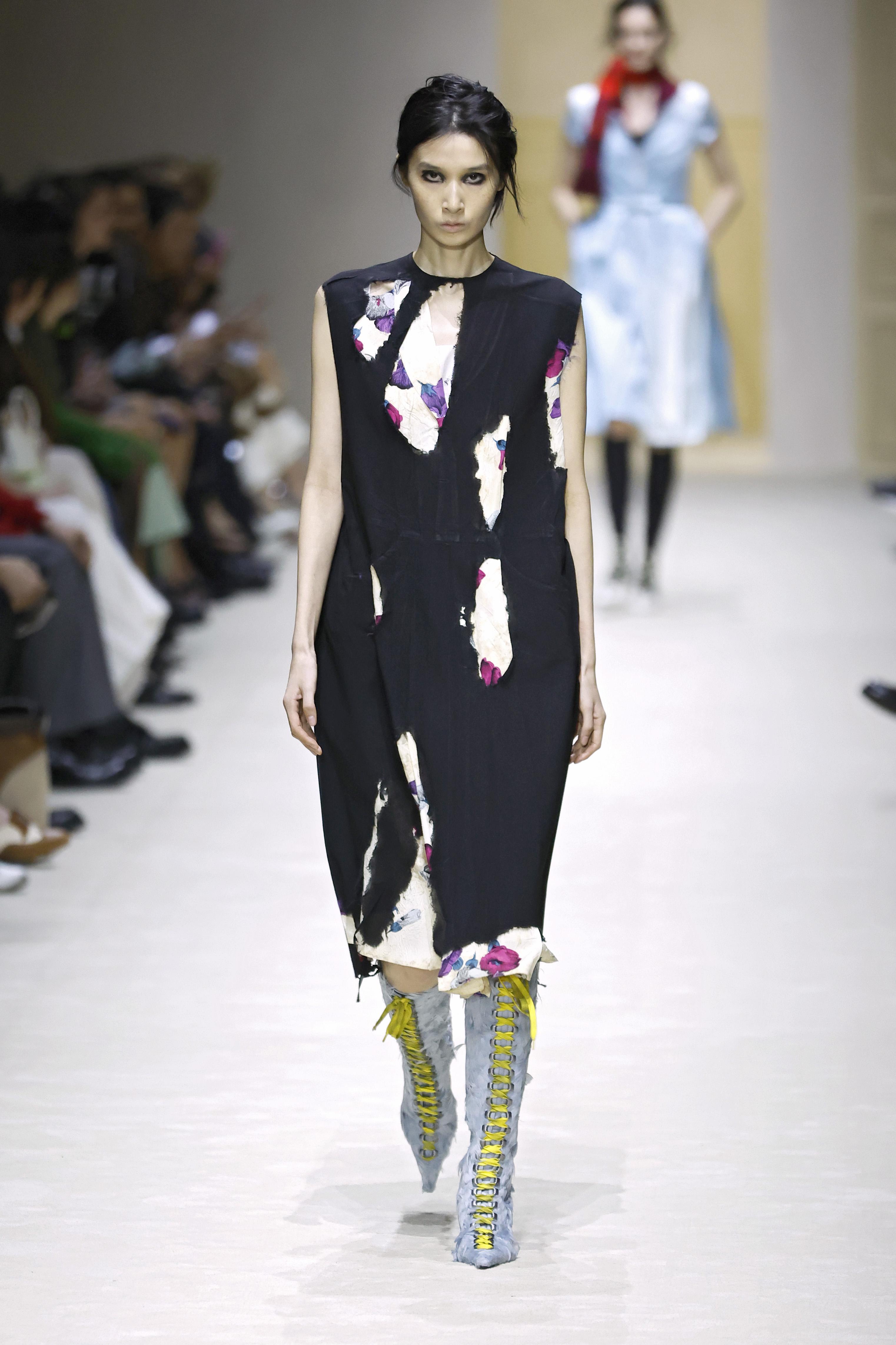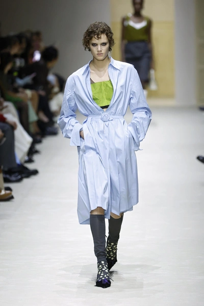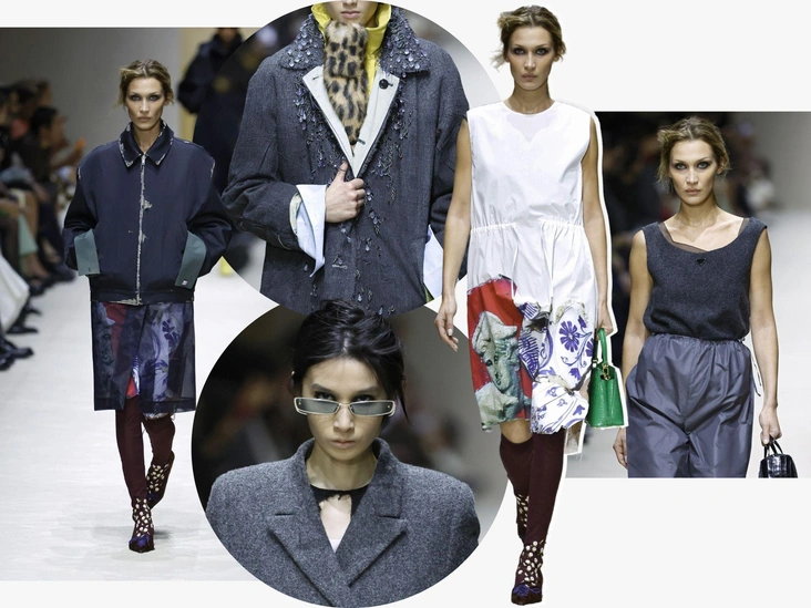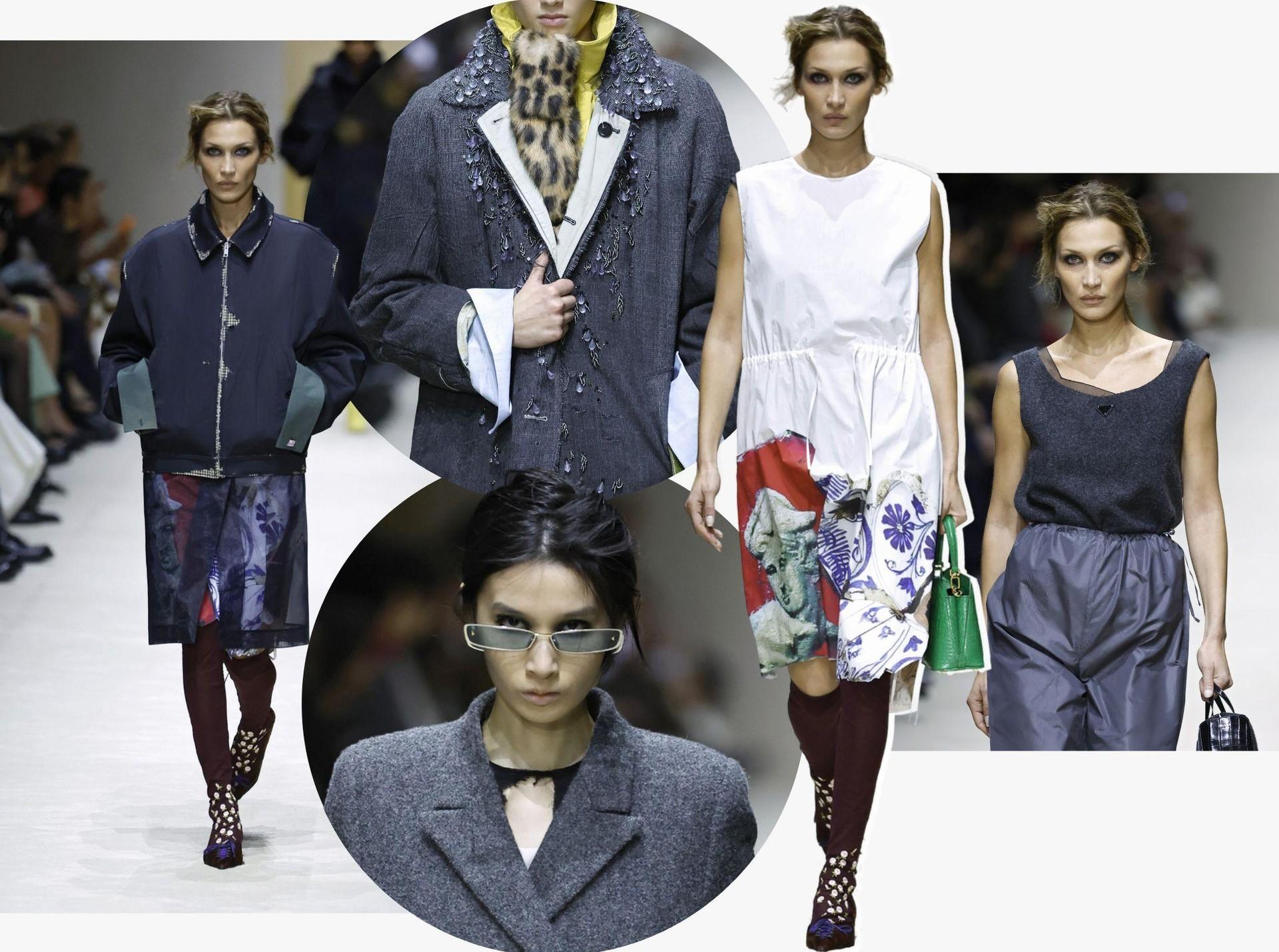 Первым делом в глаза бросаются «повидавшие виды» вещи: затертые куртки и плащи, мятые рубашки и юбки из органзы, проглядывающая из прорех разноцветная ткань. Последний прием, к слову, вдохновлен искусством. В живописи наслоенная друг на друга краска зовется pentimento — это знак того, что художник передумал в процессе работы и решил переписать часть картины. И Prada водружает поверх еще один уровень «несовершенности». Теперь из подиумных вещей нарочито торчат нитки, края тканей остаются необработанными, а дыры становятся полноценным декором.