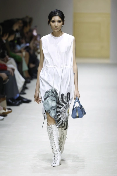 Добавляют дизайнеры и острый креатив по части декора. Туфли, если присмотреться, отделаны не только бусинами, но и перьями. Те же объемные сверкающие вышивки то и дело возникают на подолах и воротничках. А на хлопковых сарафанах расцветают настоящие картины с античными статуями.