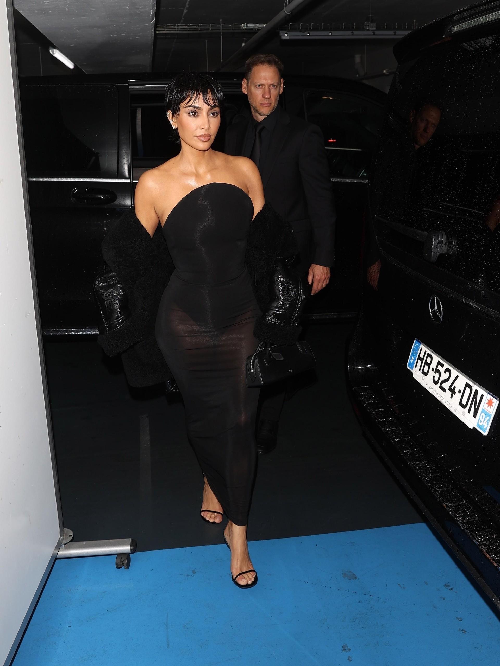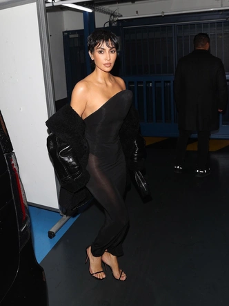 Ким появилась на улицах Парижа, чтобы посетить показ бренда Alaia, который прошел в рамках французской Недели моды. В качестве образа она выбрала тотальный черный: черное платье без бретелек с корсетным топом, сандали на ремешках и черную овчинную шубу (читайте также: 10 фото самой милой королевской пары (нет, это не Кейт Миддлтон и принц Уильям).