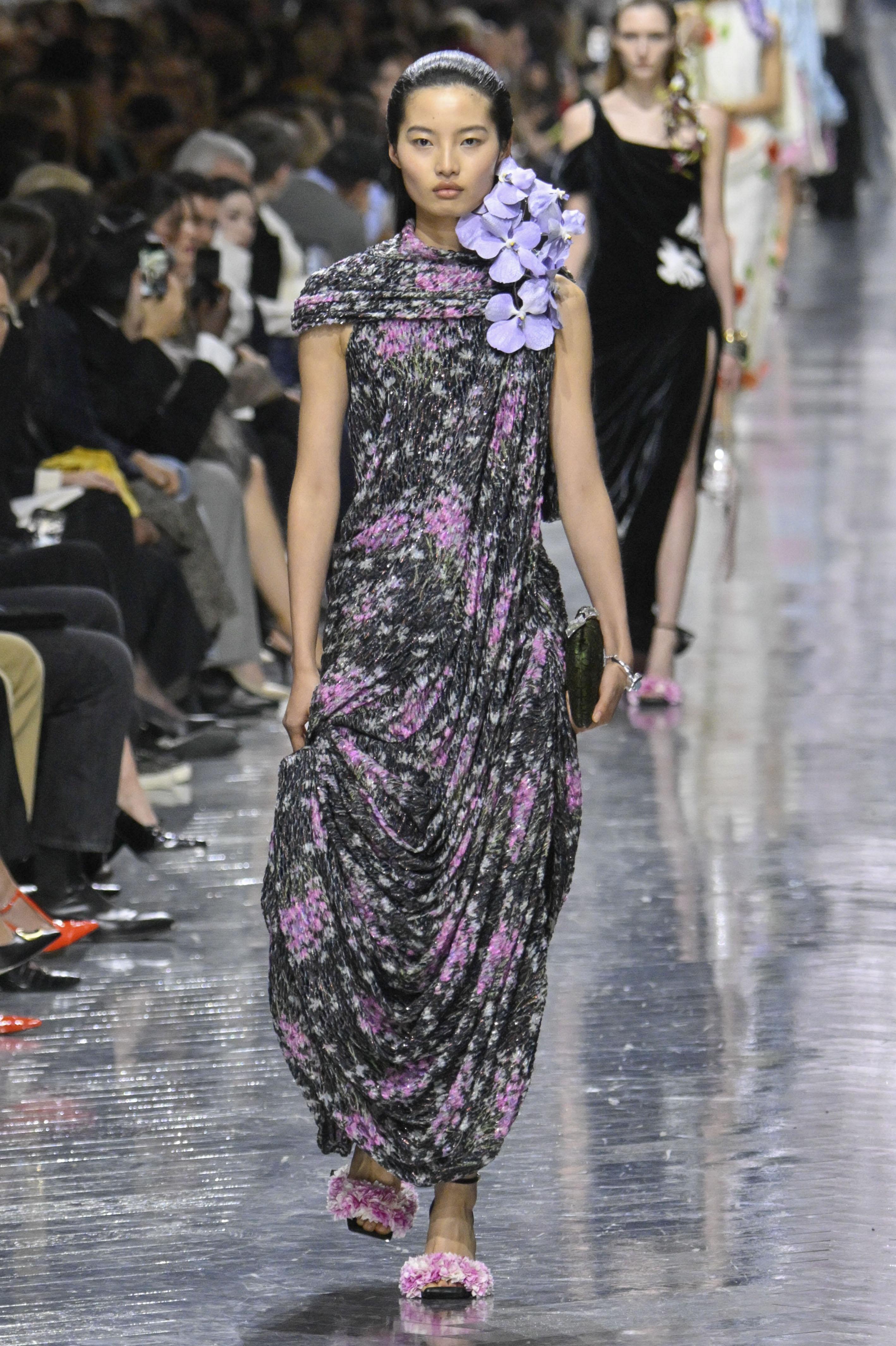 На подиумах дизайнеры работают с цветками как с графическими и архитектурными элементами: объемные аппликации, вырезанные лепестки, фактурная вышивка, которая выступает на поверхности ткани, — все это превращает платье в маленькую фешн-инсталляцию.