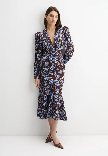 Во‑первых, принт. В этом сезоне особенно актуальны мелкие и средние бутоны — тот самый винтажный рассыпчатый рисунок, который будто перенесли с архивных образцов тканей 70‑х или с обоев в старом доме.