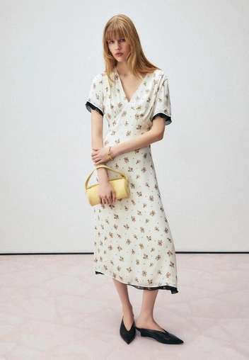 В‑третьих, ткань и фактура. Возвращаются воздушный шифон, тонкая хлопковая вуаль, летящая вискоза, но рядом с ними появляются более плотные, приземленные материалы — поплин, лен, иногда даже деним.