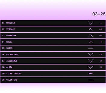 Еще одно яркое появление этого квартала — прорвавшийся на 15 место бренд SKIMS. Белье Ким Кардашьян смогло обойти даже таких гигантов, как Balenciaga, Jacquemus, Alaia и Valentino. Причем вполне заслуженно, ведь вокруг марки постоянно случались громкие инфоповоды. Летом они презентовали коллаборацию с Roberto Cavalli, выпустили рекламную кампанию с Post Malone, вскоре объявили о сотрудничестве с Nike и создали нашумевшие «пушистые» комплекты. А бра с пирсингом, анонсированный в мае, и вовсе имел такую популярность, что оказался в отдельном топе Lyst, посвященном самым виральным вещам сезона (читайте также: Феномен Skims: как рискованный стартап Ким Кардашьян превратился в миллиардный бизнес).