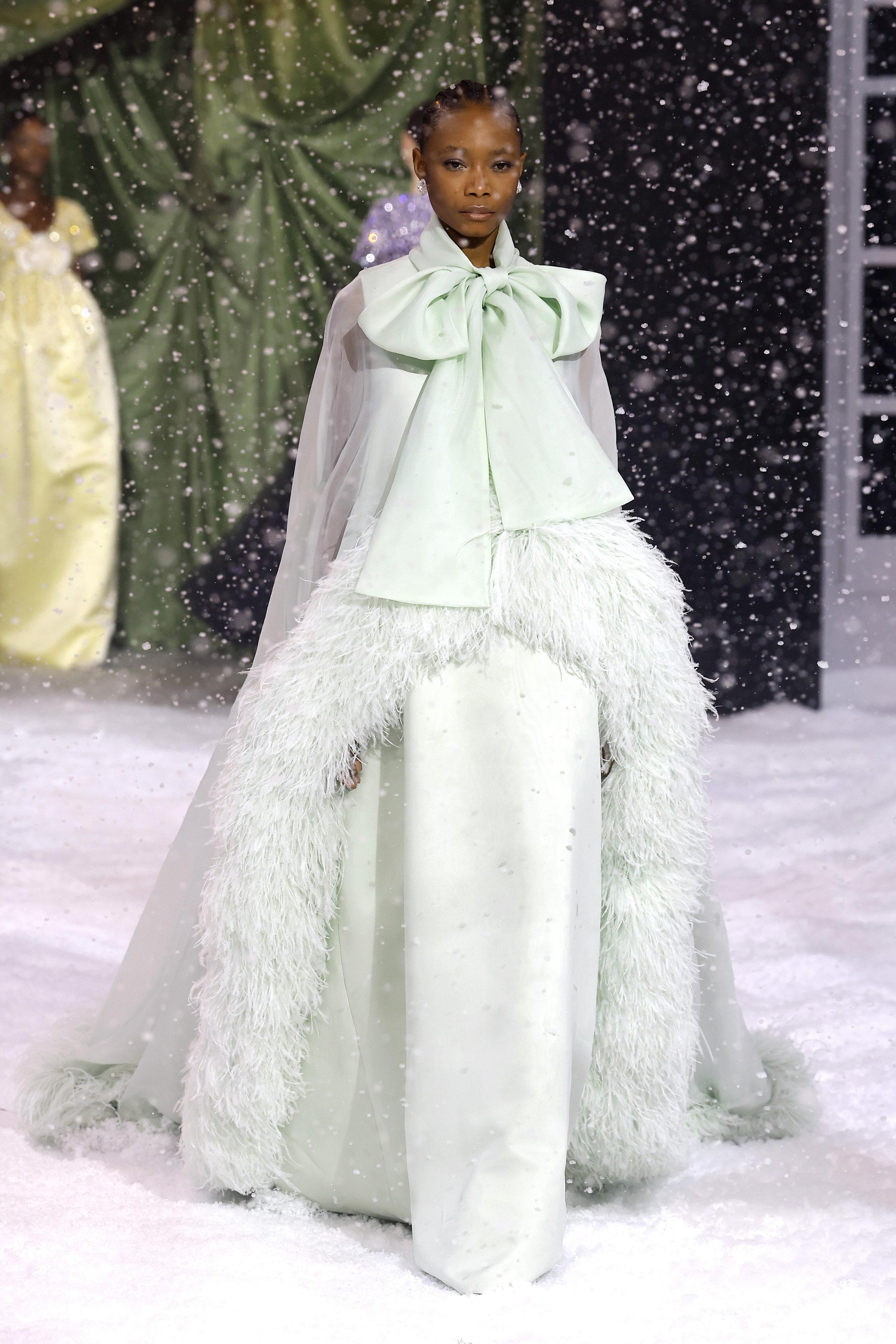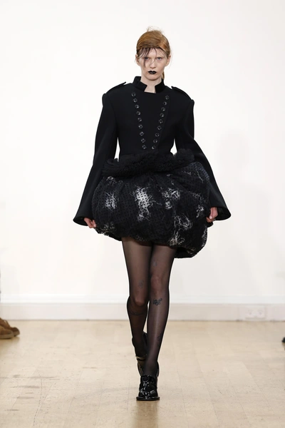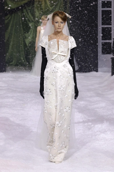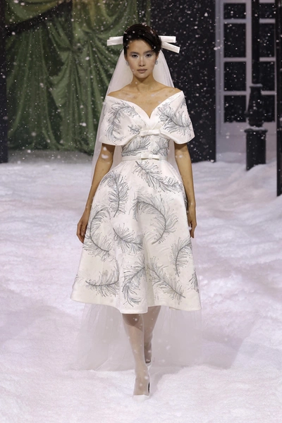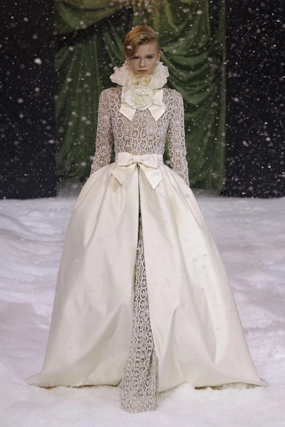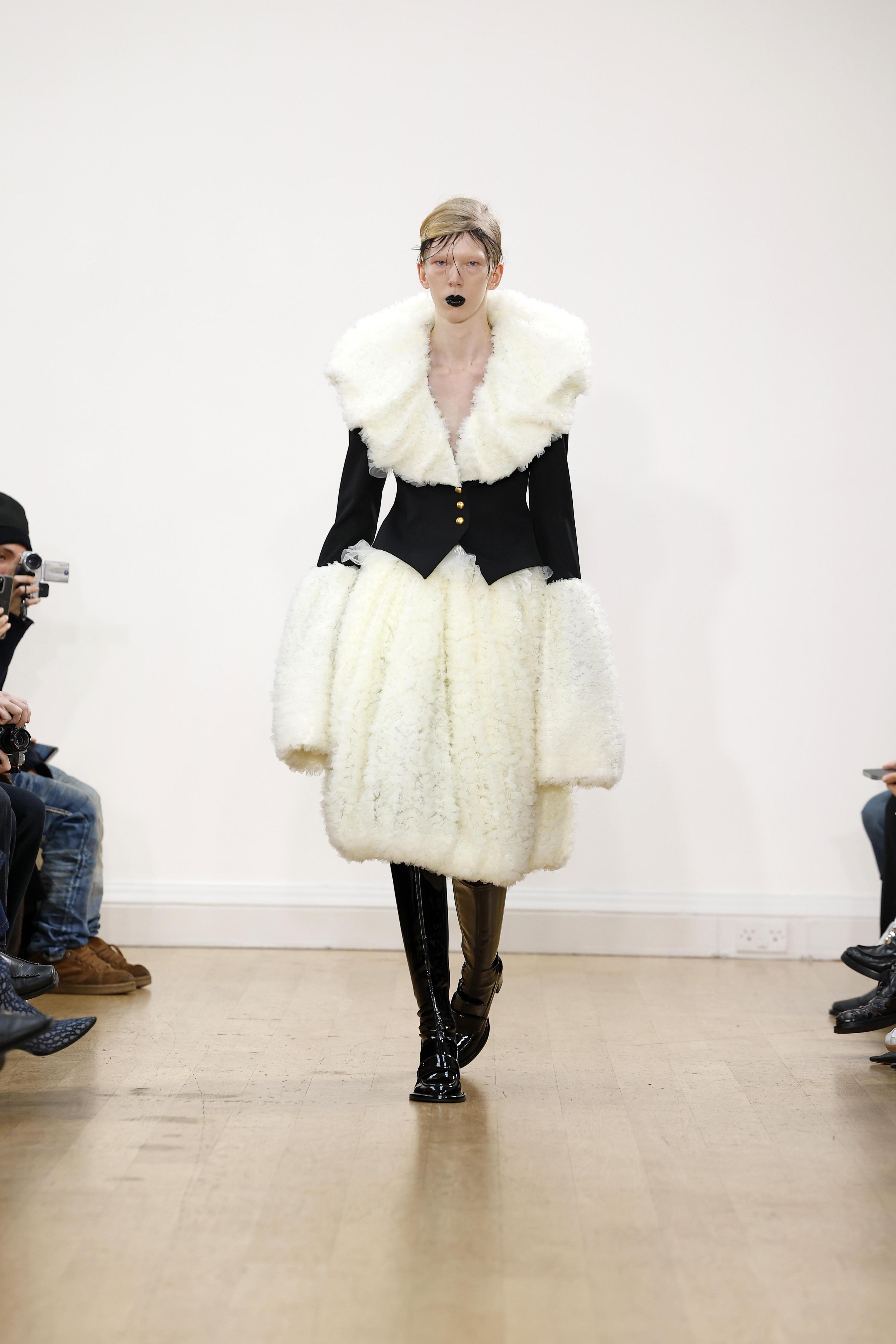 Самый холодный месяц года февраль не показал всю свою мощь в Лондоне, поэтому дизайнер Ричард Куинн сделал работу за него. На показе в рамках Недели моды неожиданно пошел снегопад, украшающий платья моделей и создающий ощущение сказки. В коллекции — как всегда женственные платья фасонов, какие были у Dior и Balenciaga с объемной юбкой и закрытым декольте. Нашли сходство со свадебными платьями? Вам не показалось, Ричард Куинн строит несколько коллекций подряд на свадебной тематике, так как его основные покупательницы — невесты из восточных стран.