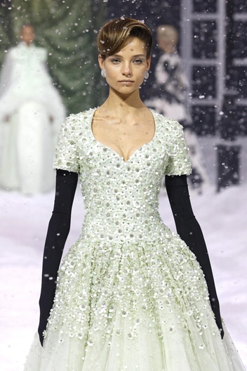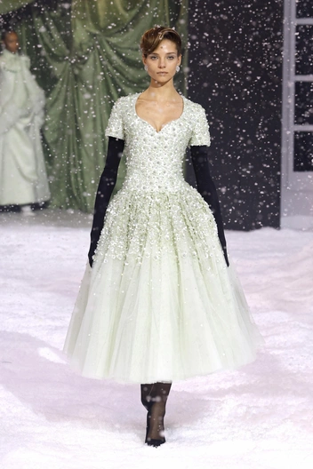 За последние годы Алеся не раз снималась для лукбуков и выходила на показы, и все это время ей прочили камбек. Не хочется зарекаться, но в сезоне 2025 все, похоже, серьезно — модель была на Неделе моды в Париже в 2024 году, показывая розовое платье от Balenciaga, а теперь вышла в одном из самых сложных платьев Ричарда Куинна. Речь о мятном наряде силуэта new look, который был усыпан стразами и пайетками. В завершении образа — черные бархатные перчатки и замшевые лодочки (дизайнер развеивает миф о том, что темное надо носить только с темным).