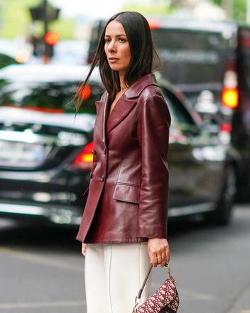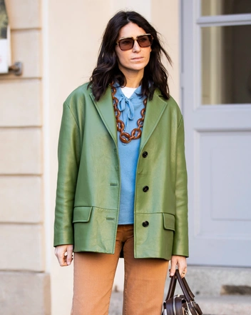 Кожаные жакеты также не теряют своей актуальности. Сейчас помимо черного цвета можно выбрать также модели роскошных карамельных или глубоких коричневых оттенков. Подобные жакеты сейчас представлены у Khaite, Nanushka, Rejina Pyo. Такой жакет является хорошей альтернативой кожаной куртке в гардеробе.