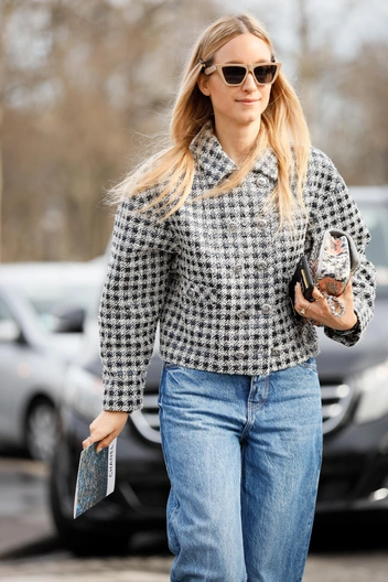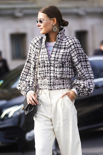 Сейчас особо актуальны укороченные твидовые жакеты в стиле Chanel. Много вариантов можно найти как в масс-маркете, так и в премиальных брендах. Такой жакет лучше сочетать с простыми джинсами, базовой футболкой, чтобы придать образу легкости и не выглядеть устаревше.