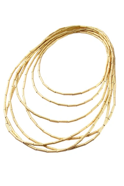 Лаконичные украшения из матового золота – оптимальный вариант для дневного образа. Колье-трансформер Fluid Gold может стать длинным сотуаром и даже браслетом и потому подойдет к любому силуэту платья или топа.