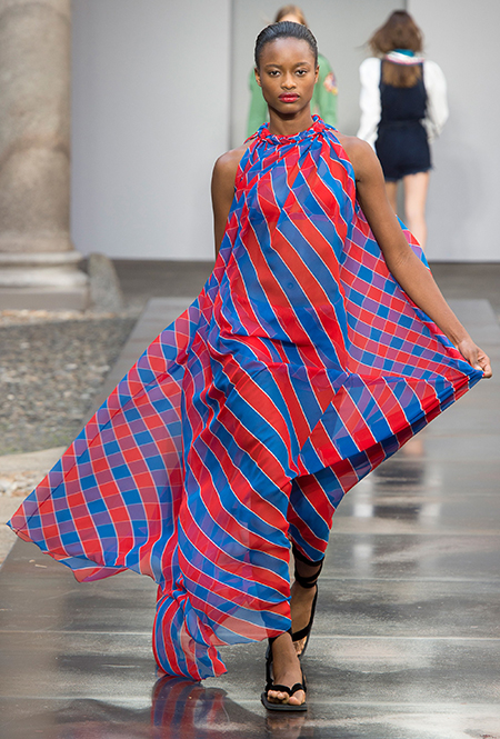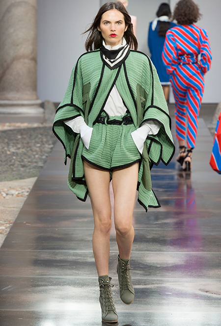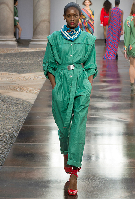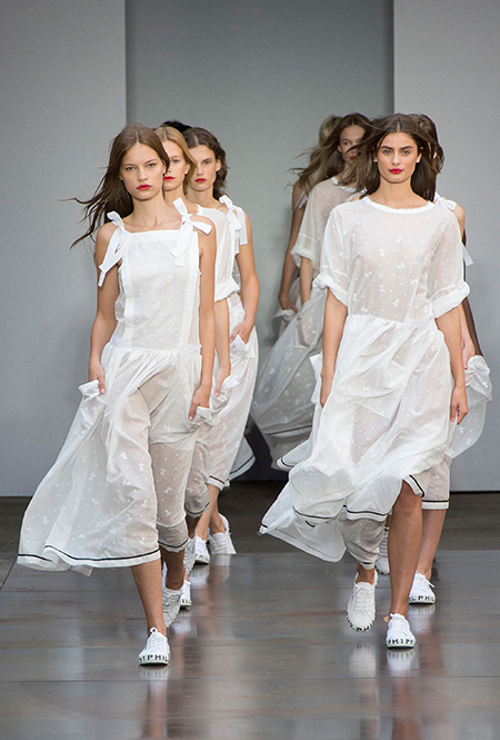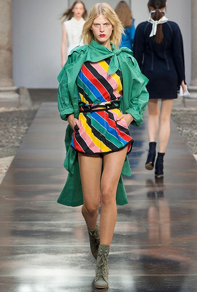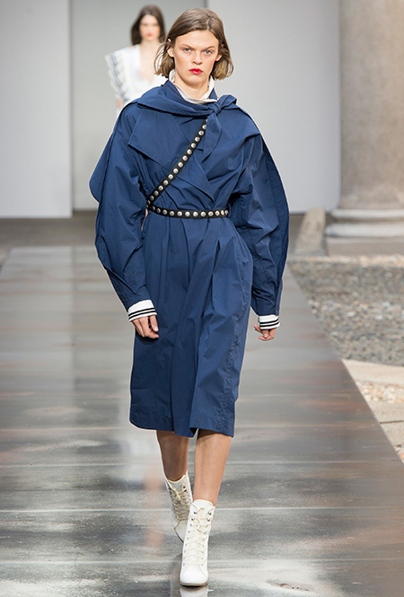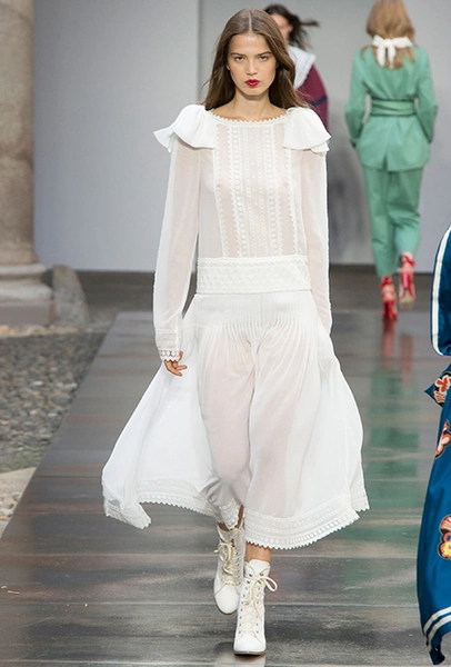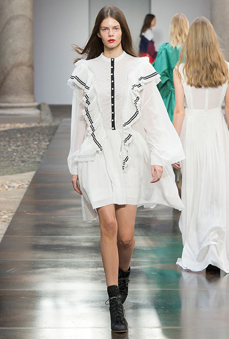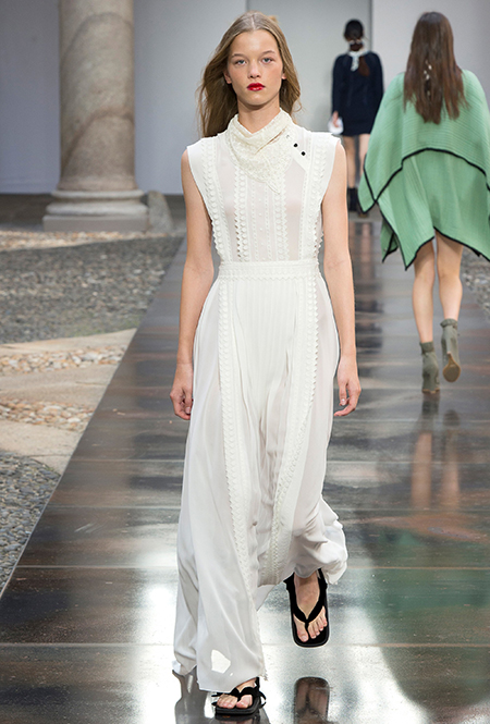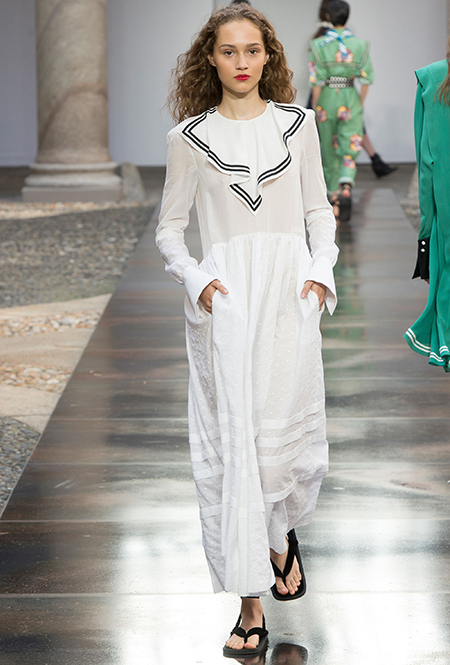 Несмотря на то, что коллекция получилась достаточно расслабленной и, как у всех в Милане, абсолютно аполитичной, Серафини не удержался от того, чтобы сделать своеобразный statement. В конце показа все модели вышли на подиум в белоснежных одеждах под анти-военную песню Боя Джорджа.