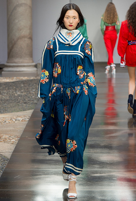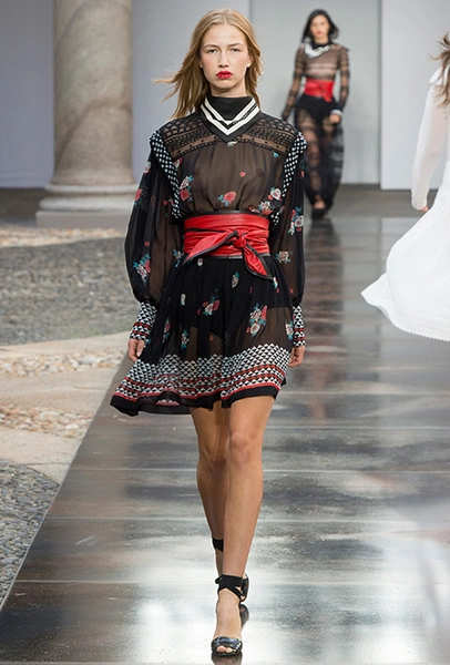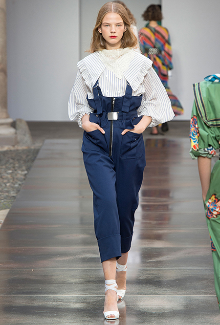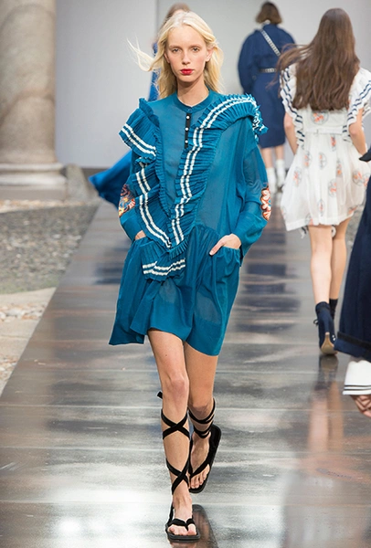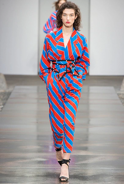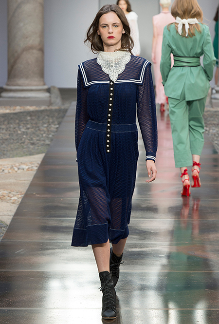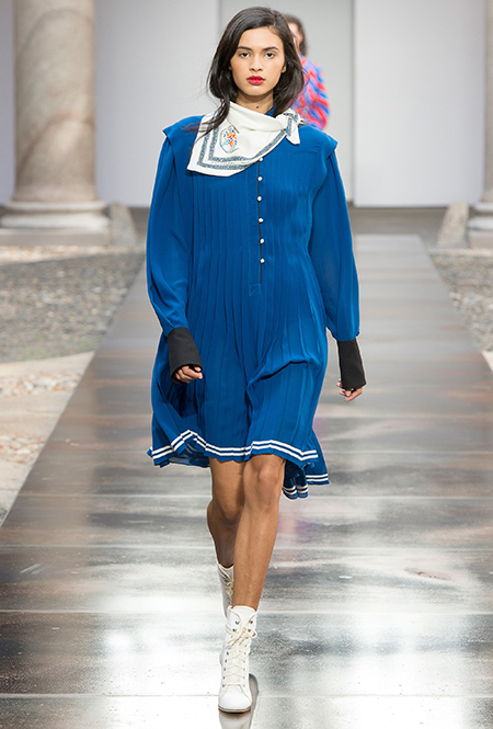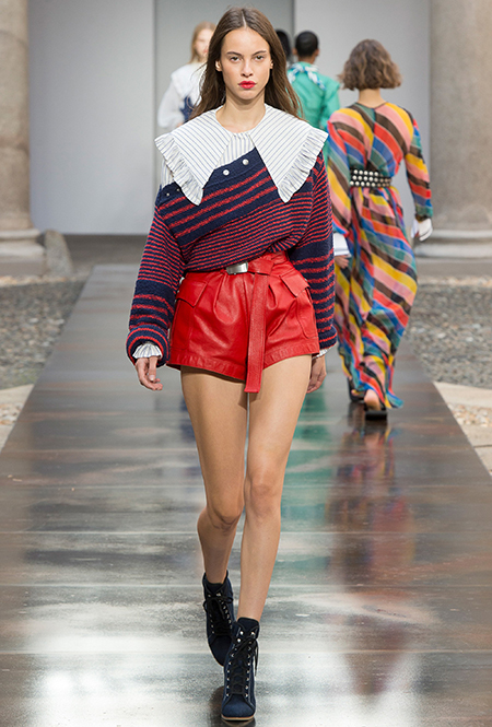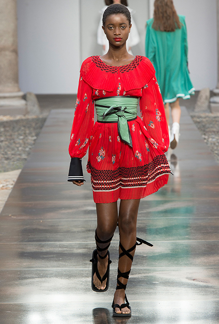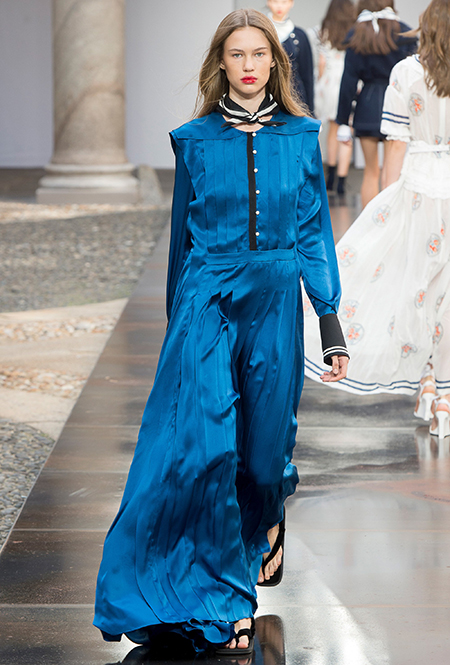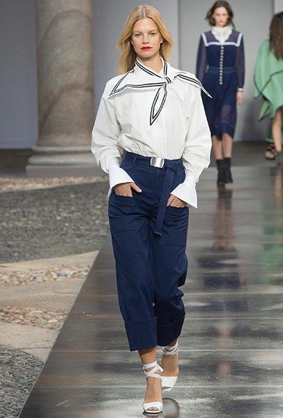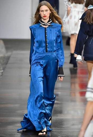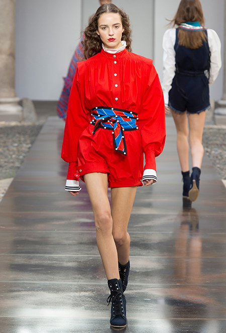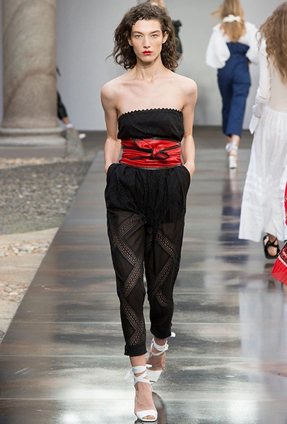 Синий цвет для коллекции вообще важен. Кроме отсылки к 80-м, здесь прослеживается и «морская» тема. Например, есть синее платье, лиф, которого отделан белыми и синими полосками, как ворот матросской формы. Похожими полосками украшены и края широких оборок на чёрных блузах и шейные платки – их у Лоренцо в этом сезоне тоже очень много. Они отсылают к стилю не то ковбоев, не то испанских торрерос. Последнее более вероятно, учитывая обилие на подиуме насыщенно-красного, иногда в сочетании с чёрным, что неизменно вызывает ассоциации с традиционным испанским костюмом. Тему этого своеобразного «кантри» продолжают и широкие красные пояса, похожие на кушаки.