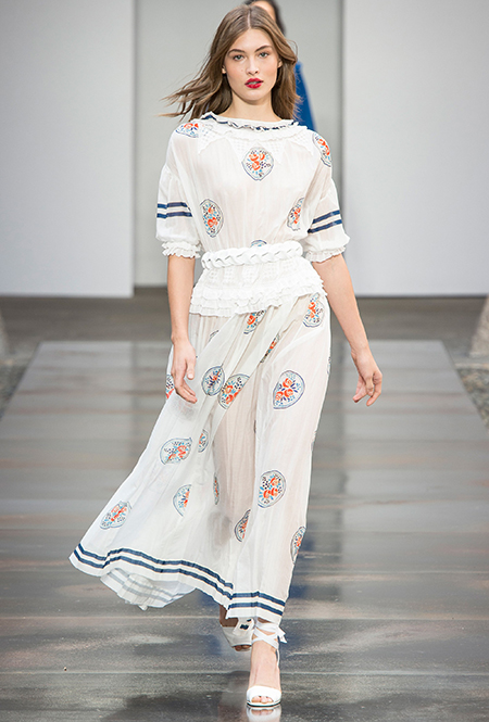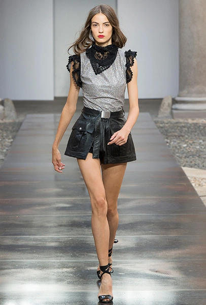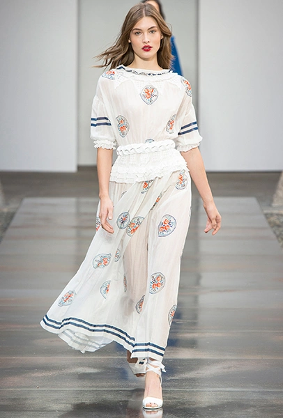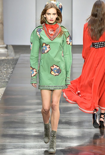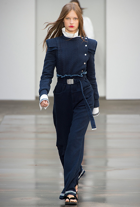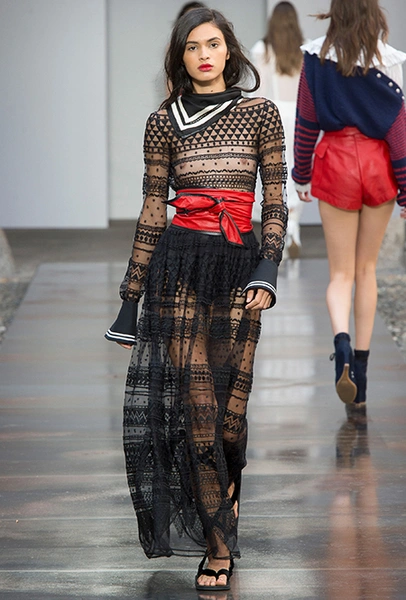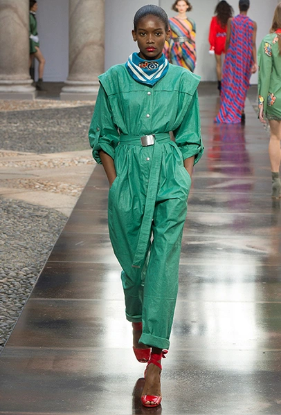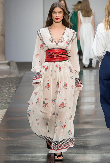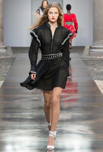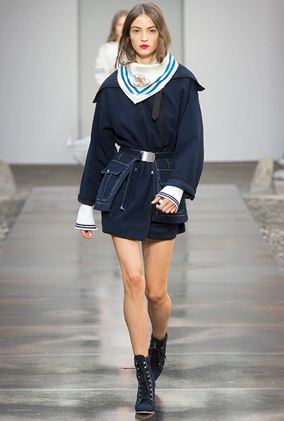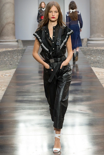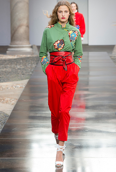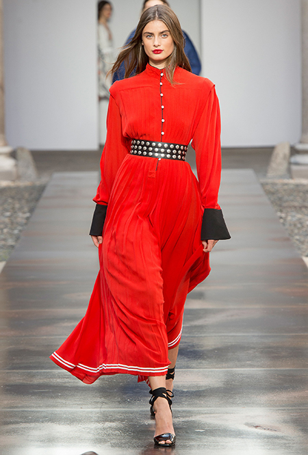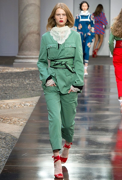 Синий цвет для коллекции вообще важен. Кроме отсылки к 80-м, здесь прослеживается и «морская» тема. Например, есть синее платье, лиф, которого отделан белыми и синими полосками, как ворот матросской формы. Похожими полосками украшены и края широких оборок на чёрных блузах и шейные платки – их у Лоренцо в этом сезоне тоже очень много. Они отсылают к стилю не то ковбоев, не то испанских торрерос. Последнее более вероятно, учитывая обилие на подиуме насыщенно-красного, иногда в сочетании с чёрным, что неизменно вызывает ассоциации с традиционным испанским костюмом. Тему этого своеобразного «кантри» продолжают и широкие красные пояса, похожие на кушаки.