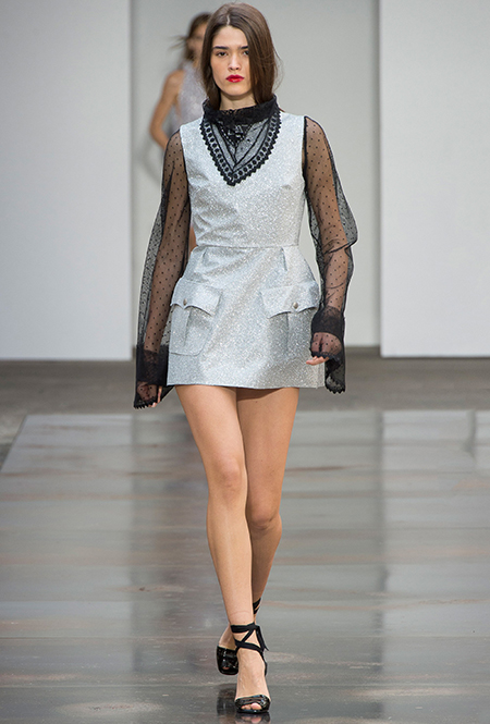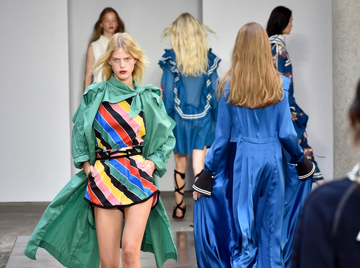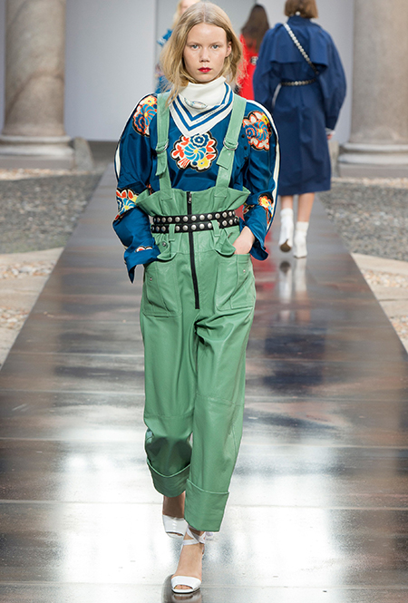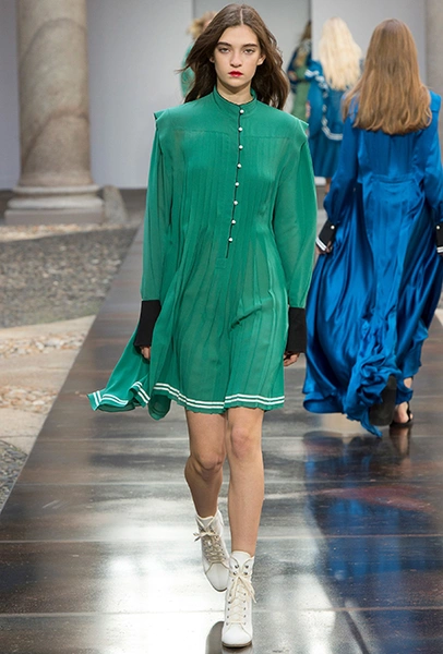 Новая коллекция Лоренцо Серафини – экскурс в 80-е, где жизнь била ключом, а о минимализме никто и не помышлял. За основу он взял стиль модных икон того времени, в частности, модели и it-girl Тины Чоу с ее любовью к широким плечам и приталенным силуэтам. Линия плеч у Серафини выразительная, но при этом не жёсткая, а чаще плавная, закругленная. Круглые покатые плечи здесь у платьев и блузок, выполненных то в бледно-зеленом, то в насыщенном синем.