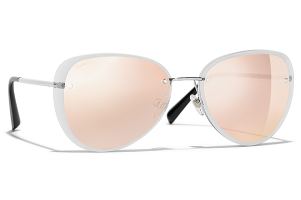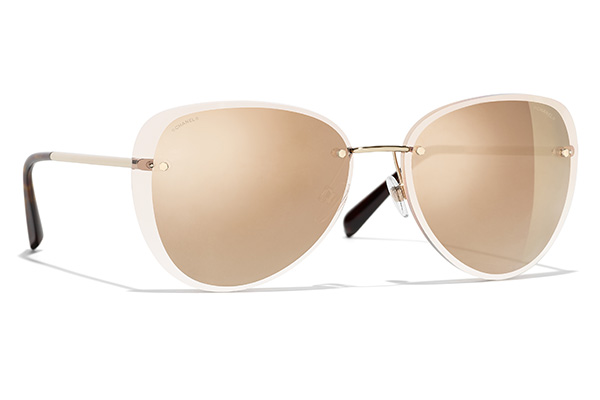 Следующая модель коллекции — бескаркасные очки. Они лишены оправы (вся передняя часть — это две большие линзы), но не разнообразия цветов: утолщенные линзы исполнены в оттенках шампанского, бронзы, серебристо-розового с синим отливом.