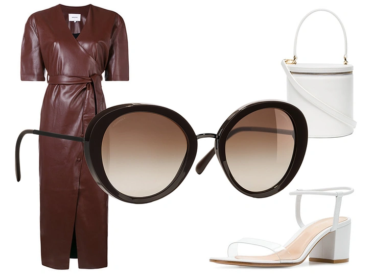Круглые очки не теряют своей популярности уже несколько сезонов, пусть и коварные узкие соперники пытались их вытеснить. Носить коричневые Chanel мы предлагаем с кожаным платьем на запахе в тон и белыми босоножками на низком каблуке с прозрачной перепонкой. Завершить образ можно белой сумкой-ведром, которая поддержит очки своей формой. Так аксессуар не будет выглядеть брошенным на произвол судьбы, а образ в целом получится свежим и модным.