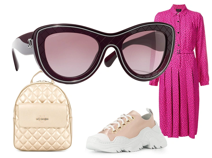 В этом сезоне смотреть на мир сквозь розовые очки больше не модно: в тренде другой яркий цвет — бургунди. Зато мы не пожалели розового в других деталях романтичного образа: платье-рубашка цвета фуксии, разрисованное в мелкие сердца, розово-бежевые ugly sneakers — получается непосредственный, но при этом модный наряд. Пусть маленький рюкзак в цвет розового золота повышает и без того высокий градус романтизма, зато его стеганая текстура удачно перекликается с дизайном очков.