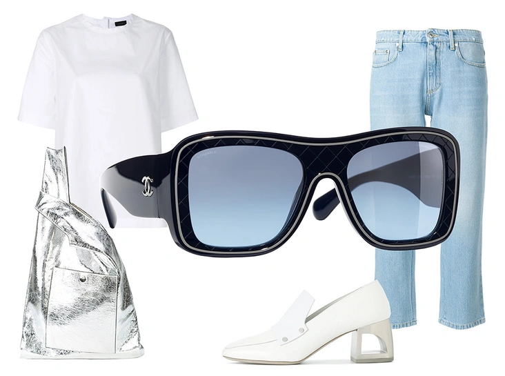 Белый цвет, конечно, легко может превратиться в серый, но модников такая непрактичность совершенно не пугает. Согласитесь, что летом найти замену белой футболке довольно-таки трудно. Ее мы вам и предлагаем в качестве основы для повседневного наряда с прямыми укороченными джинсами. Серебряная сумка-шоппер избавит образ от клише «голубые джинсы-белая футболка», в которую также можно сложить ноутбук и отправиться в офис, а после — спрятать рабочую сменку и умчаться на концерт любимой группы. Очки Chanel в этом образе, безусловно, главные герои. На то и расчет!
