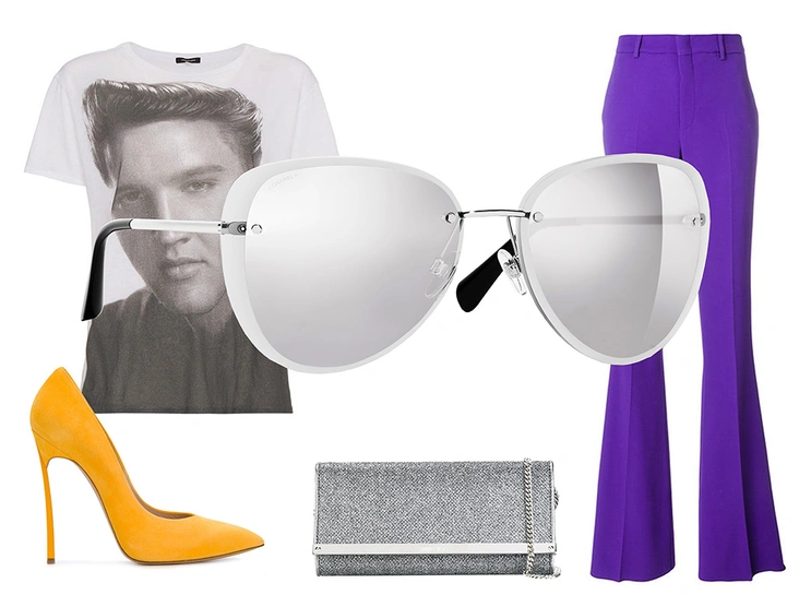 Мода из года в год играет яркими красками: в этом сезоне главным цветом назван фиолетовый. Так что микс из брюк на высокой талии и желтых лодочек на шпильке не только визуально вытягивает фигуру, но и вполне уместно смотрится в солнечную погоду. А белая футболка с неярким рисунком, серебристый клатч и очки с напылением добавят образу легкости.
