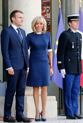 Однако герцогиня Сассекская — не единственная, кто пользуется приемами психологии цвета и выбирает синий одним из ключевых в палитре делового гардероба. Поклонницей оттенков нэви стала первая леди Франции Брижит Макрон. Ее стиль всегда строгий, но лаконичный и разнообразный. Она предпочитает минимализм как во время официальных визитов, так и в повседневной жизни, поэтому правильно подобранный оттенок во многих ее образах играет ключевую роль. Не удивительно, что Макрон — фанатка всех оттенков синего, и в этом цвете она выбирает и базовые скинни-джинсы, и строгие жакеты с крупной фурнитурой, и приталенные пальто.