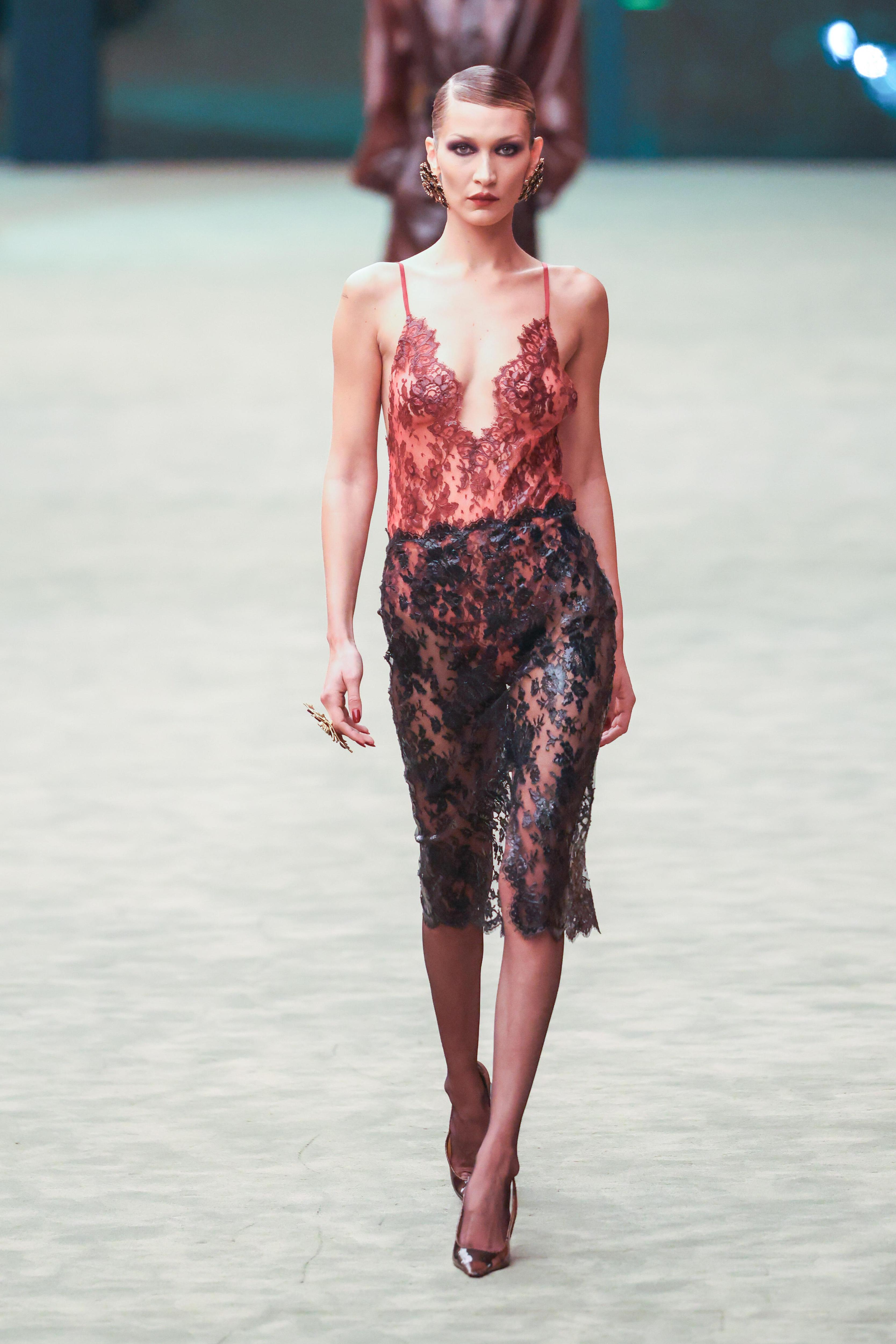Параллельно меняется и язык сексуальности. Если раньше кружево ассоциировалось с чистой романтикой или классическим бельевым стилем, то Энтони Ваккарелло в Saint Laurent делает с ним нечто совершенно иное. Он соединяет воздушный материал с кожей, лакированными поверхностями, строгими силуэтами, превращая его из милой детали в инструмент сильного, контролируемого соблазна.