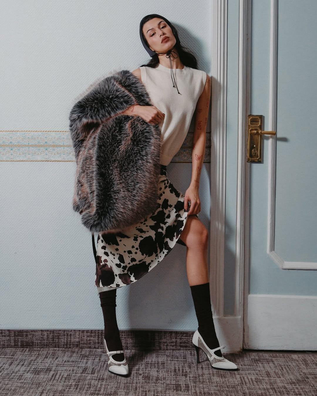 К пазле отечественных коллабораций важную роль играет и лукбук для Sanchy, снятый Ибрагимом Гатциевым. В этой истории Эрика предстает в образе современной дивы: чуть драматичной, очень притягательной, но без утрированной ретро‑маски. Леопардовый принт, атлас, яркий искусственный мех, шелковые комбинации и фирменные бельевые юбки Sanchy здесь раскрываются с новой стороны — вещи «хорошей девочки» обретают характер и остроту, а союз героя, бренда и фотографа превращается в по‑настоящему сильный модный жест.