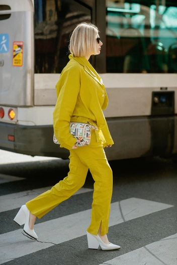 Этот цвет выразительно и аристократично смотрится на загорелой коже и одновременно подчеркивает смуглую кожу. Обладательницам холодного тона волос и кожи следует обратить внимание на лимонный оттенок или желто-зеленый лайм, при теплом же — на глубокие желтые цвета: банановый, например, или охру.