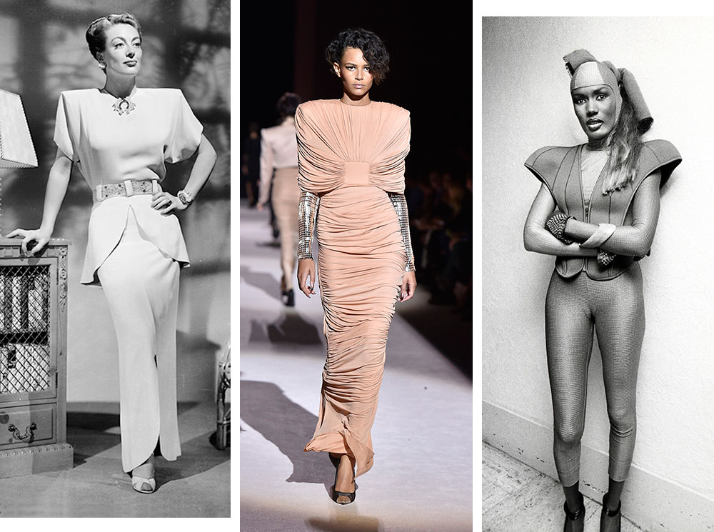 Саму конструкцию подплечников сложно назвать свежей идей. Она была разработана в 1877 футболистом Принстонского Университета по имени Л.П.Смок (L.P. Smock) в качестве части униформы для игры в американский футбол и стала обязательным атрибутом на поле примерно в середине 1920-х годов. При этом к моде такие массивные накладки не имели никакого отношения вплоть до 30-х, пока известная своим увлечением сюрреализмом и экспериментам в одежде Эльза Скиапарелли не поместила их на хрупкие женские плечи. Творения французского дизайнера можно смело назвать предтечей социальных перемен и модных революций: ее одежду обожали смелые и амбициозные женщины и ненавидели «обыкновенные». Структурированные жакеты, пальто и платья Скиапарелли с «сильными» плечами придавали ее клиенткам чувство уверенности и превосходства и обеспечивали щедрую долю внимания, где бы они ни появлялись.