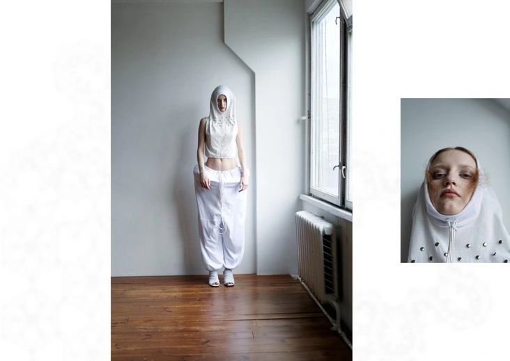 «Когда мы говорим про апсайкл, первое, что приходит в голову, — сшитая из множества кусочков одежда, сочетание ярких цветов. Мне хотелось избежать прямой ассоциации, взглянуть на процесс по-новому — к каждому предмету одежды я отношусь как к музейному экспонату. За основу беру сменные рукава, шемизетки, воротники и карманы на завязках — так я решаю нехватку одного типа ткани, а также избавляюсь от большого количества обрезков, разумно используя все остатки».