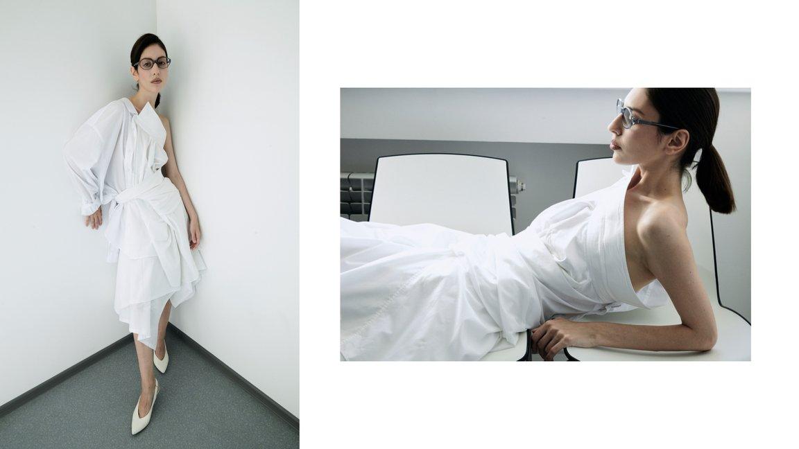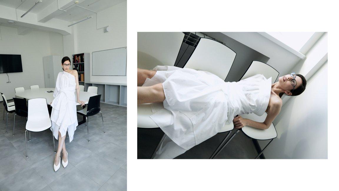 В своей капсуле 40/S он отказался от традиционного представления летящего белого платья с акцентной талией и пышной юбкой, сделав ставку на создание визуально объемных и пространственных вещей. Пиджак-пальто, асимметричную юбку и топ можно посмотреть и оценить вживую в торговом центре «Атриум».