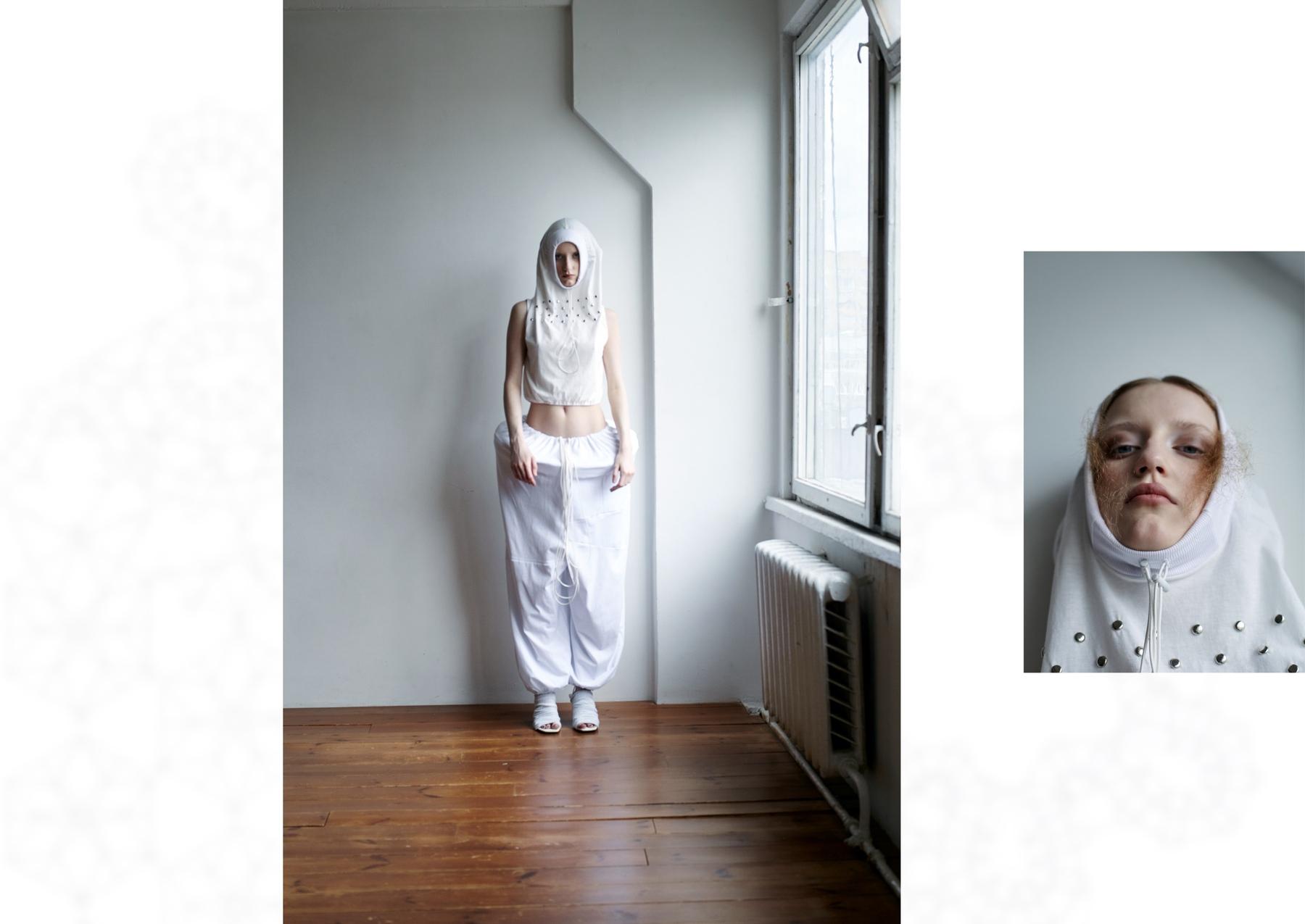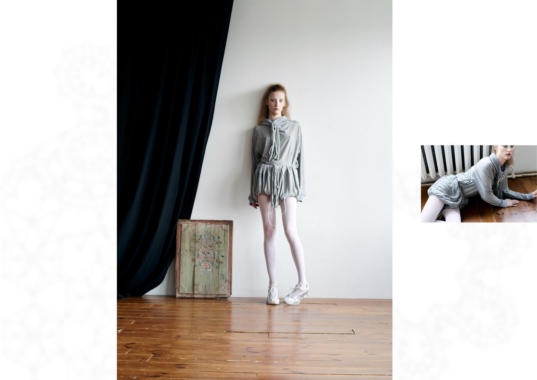 «Когда мы говорим про апсайкл, первое, что приходит в голову, — сшитая из множества кусочков одежда, сочетание ярких цветов. Мне хотелось избежать прямой ассоциации, взглянуть на процесс по-новому — к каждому предмету одежды я отношусь как к музейному экспонату. За основу беру сменные рукава, шемизетки, воротники и карманы на завязках — так я решаю нехватку одного типа ткани, а также избавляюсь от большого количества обрезков, разумно используя все остатки».