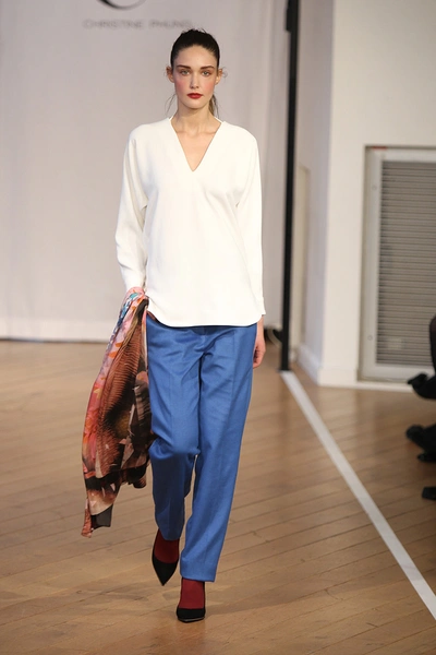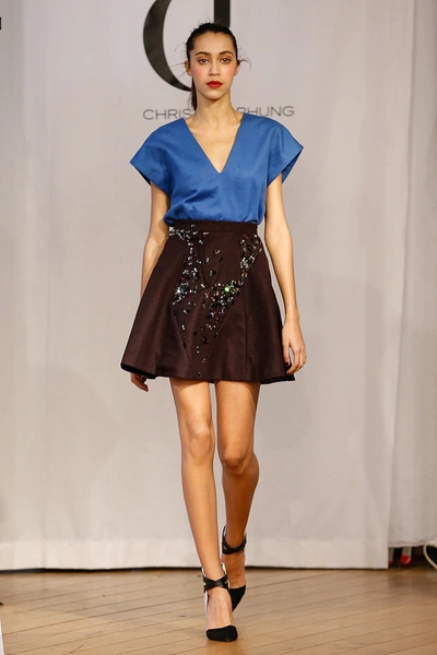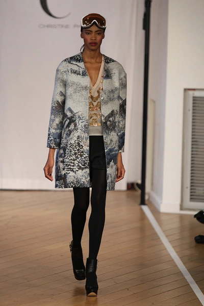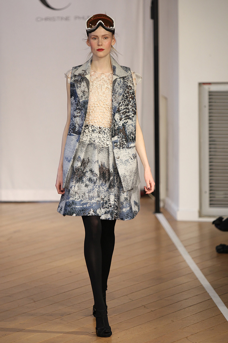 Все принты в ее коллекции напоминают об отдыхе в горах: заснеженный лес присутствует на удлиненном жилете, плиссированной юбке и пальто, а жаккардовые синие части платьев и костюмов, украшенные кристаллами, напоминают о холоде и снеге.