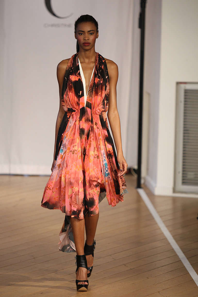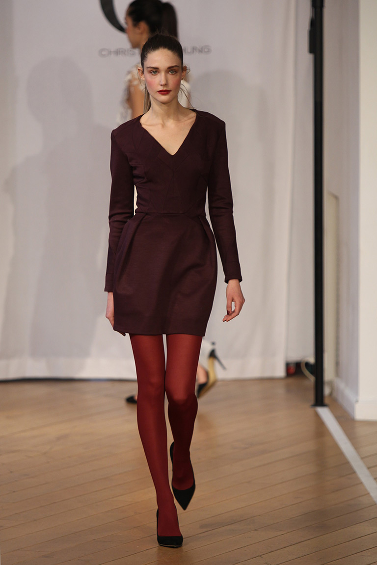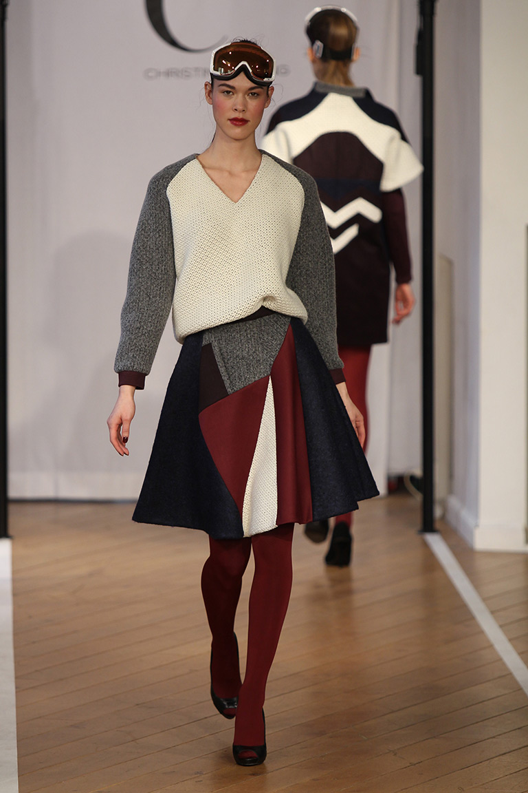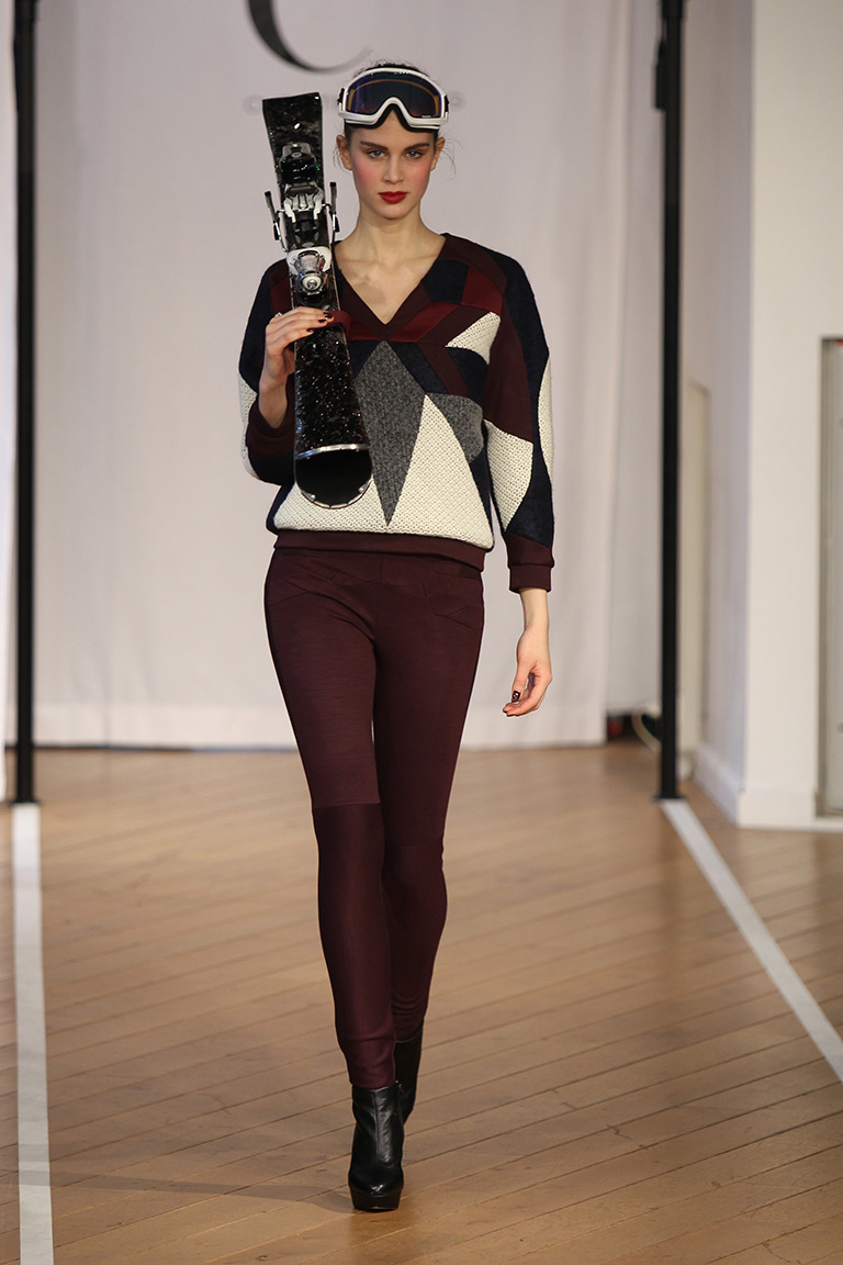 Ее показ начался с горнолыжного ансамбля: свитера, брюк с завышенной талией, очков и лыж, которые опирались на плечо модели. После этого дизайнер представила женственные платья в стиле flouncy dirndls — с короткими рукавами, V-образным вырезом и широкими юбками.