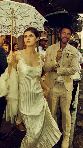 Свадебные образы жениха и невесты — словно сцена из фильма. Актриса Александра Даддарио обручилась этим летом с продюсером Эндрю Формом в шелковом плиссированном платье с фатой Danielle Frankel. Свадебный бренд не так популярен, но выбирают его невесты со вкусом: в его костюме появилась на своей предсвадебной репетиции и Наоми Байден. Основанием наряда Даддарио стал корсет с кружевными бретелями и открытой спиной. Не оторвать взгляд и от кольца с огромным голубым камнем, цвет которого идеально подходит глазам актрисы.
