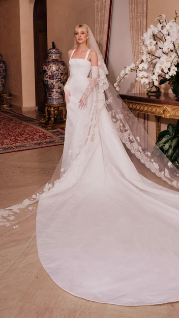 Вот он — образ современной невесты. Модель Дафна Гроенвельд вышла замуж в изящном платье-комбинации Galia Lahav с расклешенной юбкой, открытой спиной и драпировкой на талии. Главный дизайнер модного Дома Шэрон Север позже говорил о наряде знаменитости: «Она тогда сказала мне, что хотела бы современное, невычурное платье с открытой спиной. Мы выбрали крой, который смог подчеркнуть ее невероятный силуэт и статную фигуру. Для Дафны было важно, чтобы платье отражало ее на 100%. Я просто черпал вдохновение в ней и ее представлениях».