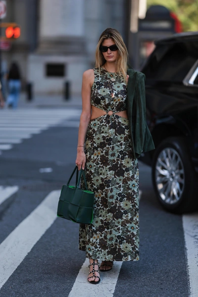В жаркий сезон стиль бохо с его легкой небрежностью — на пике моды. Но не спешите присматриваться к пестрым расцветкам и обратите внимание на однотонные платья с цветами, вырезанными лазером. Фактура, созданная таким узором, добавит воздушности и романтичности всему образу вне зависимости, какую длину платья вы предпочтете. Поэтому к месту будут контрастные делали — босоножки на тонких ремешках, кожаная сумка-мешок и минималистичные аксессуары (читайте также: 9 цветов, с которыми нельзя носить белый — они смотрятся безвкусно и дешево).