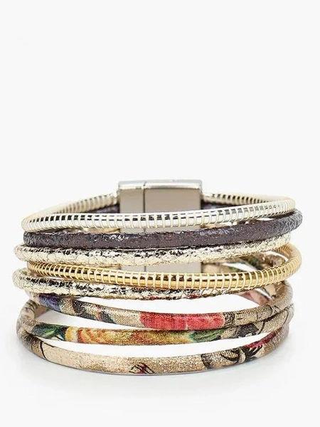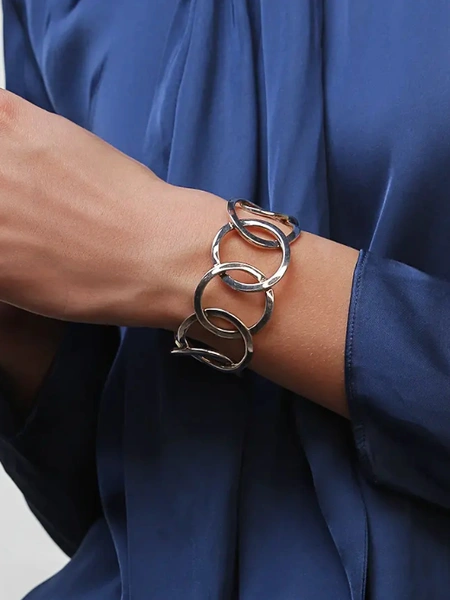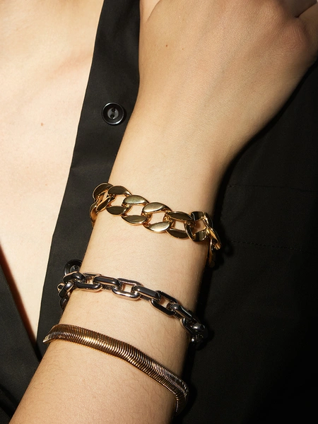 Один из самых актуальных способов носить вышеупомянутые крупные браслеты — надевая сразу несколько. Некоторые марки сразу продают украшения сетами, а где-то придется включить фантазию и придумать композицию самостоятельно. Главное правило этого года — чем больше украшений, тем лучше. Смело объединяйте разные оттенки металла, крупные и мелкие браслеты, а также аксессуары разной формы. Браслеты также можно носить сразу на двух руках.