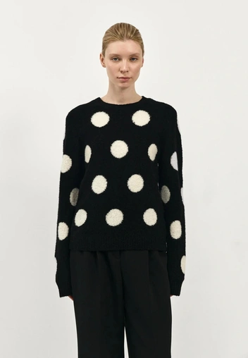 Если ваша монохромная трикотажная база уже укомплектована и вы в поисках трендового свитера на эту зиму, то обратите внимание на очаровательные горошинки разных цветов и размеров.