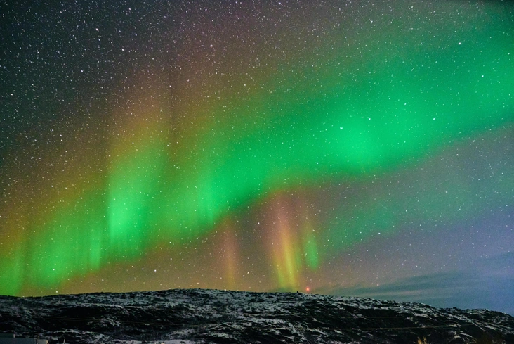 Второе чудо Арктики, за которым в Териберку съезжаются со всей страны, — это, конечно, северное сияние. Увидеть его — настоящая удача, и чтобы все состоялось, вам в первую очередь должно повезти с погодой (а она на Кольском полуострове переменчивая). Главные условия: ясное небо и отсутствие светового загрязнения, поэтому лучше уехать подальше от населенных пунктов, чтобы городские огни не приглушали многоцветную Аврору.
