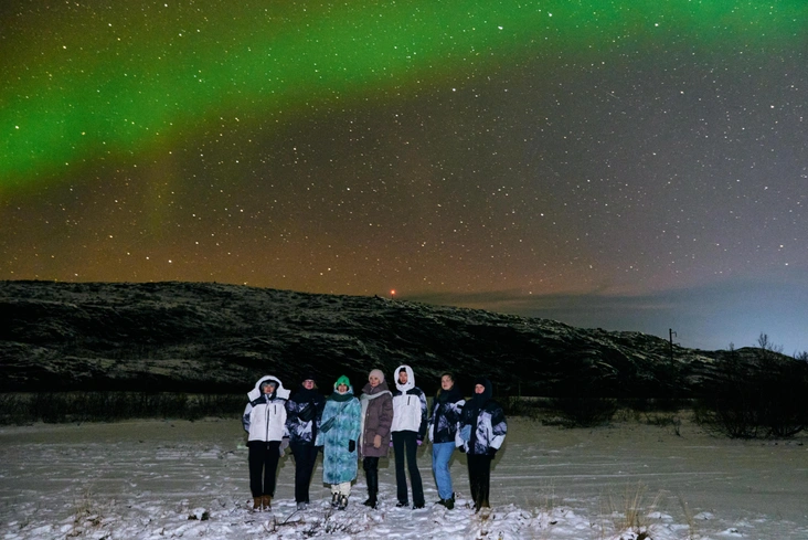 Уже в 15 минутах езды от Териберки мы нашли тихую поляну, и нашему взору открылось небо, усыпанное мириадами звезд. Первые полчаса небольшие свечения можно было уловить только благодаря длинной выдержке на телефоне (ну и собственной выдержке и терпению, конечно же). Со временем блики становились все ярче, начинали играть и переливаться — сначала белым цветом, потом оттенки становились все более различимыми. Зрелище настолько фантастическое, что первое время сложно поверить своим глазам. Одеться на такое событие стоит тепло: северное сияние — явление довольно взыскательное и радует только тех, кто умеет ждать. Мы были экипированы с ног до головы и не пожалели: флисовые костюмы и пуховики от Baon прошли вторую проверку.