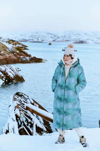 Териберка находится на самом краю земли, на берегу Баренцева моря, поэтому первым делом стоит арендовать небольшое судно, чтобы познакомиться с главными царями Севера — китами, а также тюленями, моржами и касатками. Кое-кто из арктических жителей заплывает в бухту, но если вы нацелены серьезно, лучше выходить в открытое море. Здесь наши пуховики ждало самое непростое испытание: порывистый ветер, холод и слепящее солнце. С первым верхняя одежда справилась на ура: куртка непродуваемая, поэтому можно находиться на палубе в течение двух часов и не замерзнуть. Пуховик застегивается на молнию, скрытую ветрозащитным клапаном с кнопками, а на груди располагается карман с влагонепроницаемой застежкой, позволяющей надежно защитить самые ценные вещи. Особенно важная функция для журналиста, который хочет снимать на телефон каждый свой шаг.