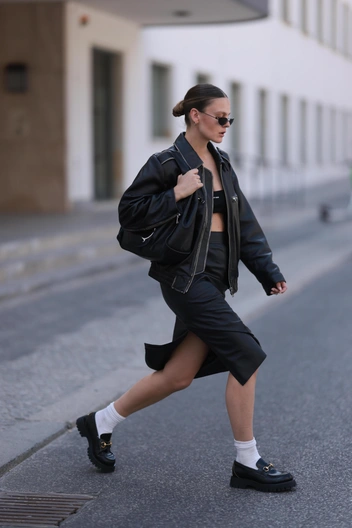 В тренде продолжают оставаться косухи и кожаные куртки в байкерском стиле родом из нулевых — марки предлагают интегрировать их в кожаные тотал-луки. Но будьте осторожны, так как с материалом легко переборщить. Если вы выбираете акцентную верхнюю одежду, тогда низ и остальные слои образа должны быть минималистичными и простыми.