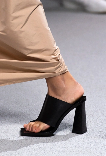 Дизайнеры продолжают развивать направления, вдохновленные стилем 90-х. В кожу мы уже вдоволь наигрались, теперь на очереди – микро-тренды конца XX века, такие как квадратная форма мыса или минималистичные мюли на каблуке. Если удастся соединить в одной паре и то и другое – еще лучше. Законодателями тренда стали, конечно, Bottega Veneta, которые представили лаконичные плетеные мюли на каблуке. Но и другие бренды показали немало стильных интерпретаций – как из мягкой кожи нейтральных оттенков, так и яркие модели с металлизированными вставками.