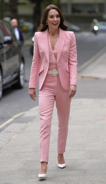 Конкретно костюм принцессы был в пастельном розовом цвете с коралловым оттенком. Она разбавила его белыми жемчужными серьгами, поясом и лодочками от Jimmy Choo, а наверху оставила блузу в том же цвете, что и костюм.